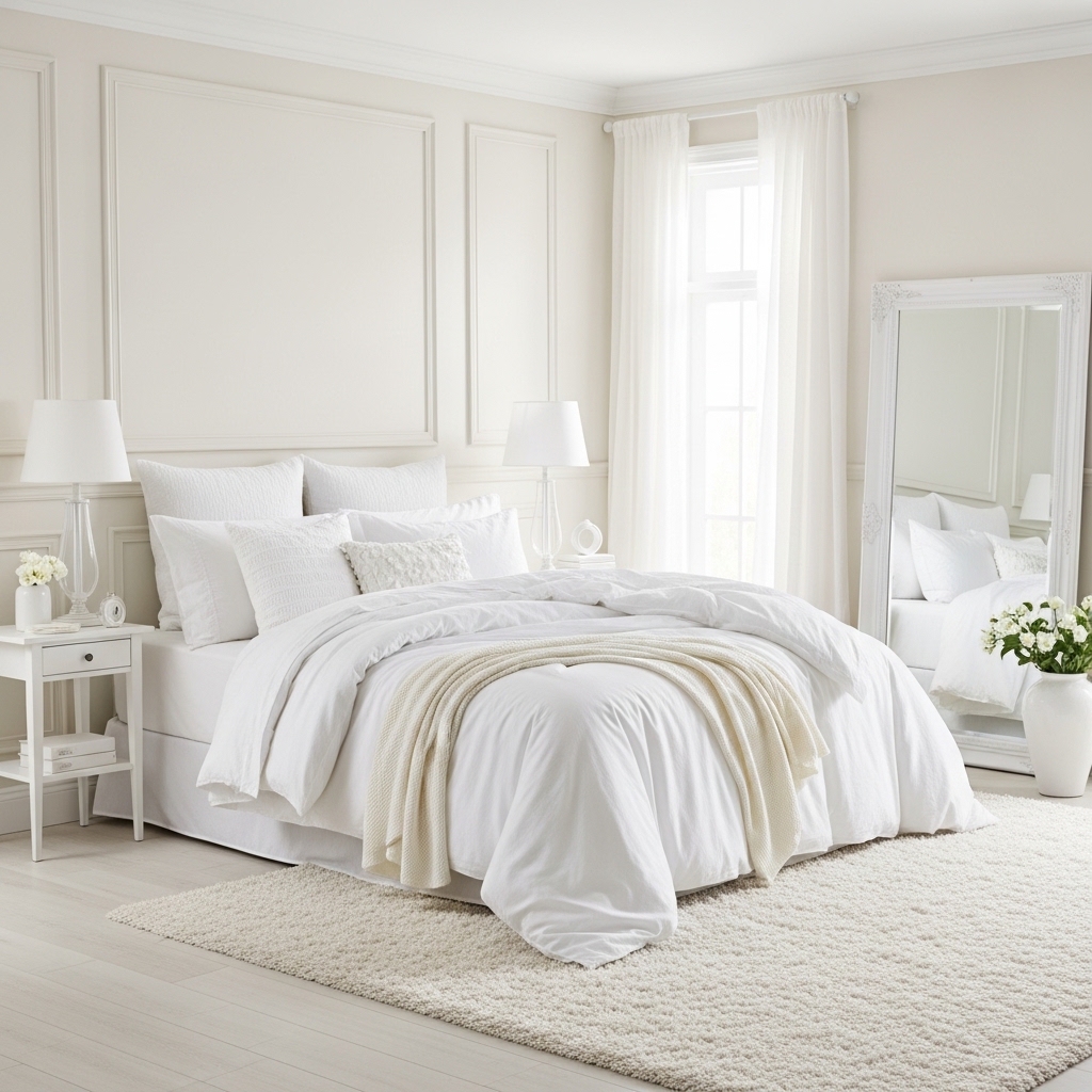 An all-white bedroom palette creates a clean and timeless look. Layering different shades of white and off-white adds depth and prevents the room from feeling flat.