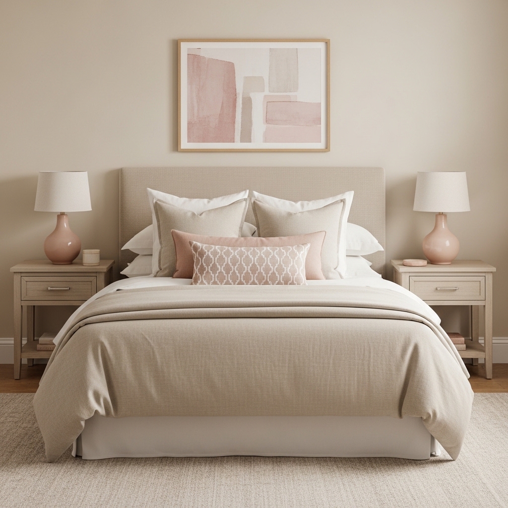 Adding a hint of soft blush to a beige palette introduces warmth and subtle color without losing the neutral aesthetic. This combination creates a soft and romantic bedroom look.