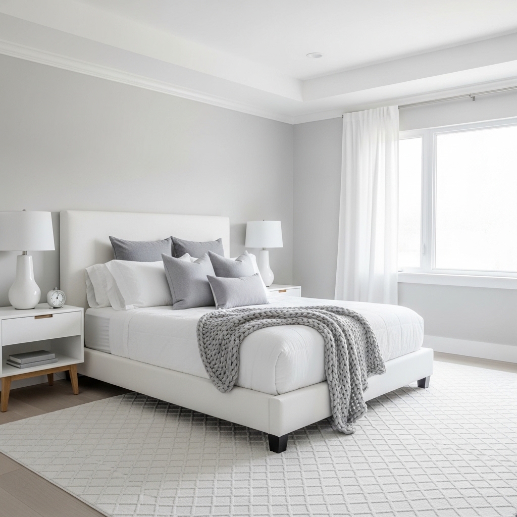 White and soft gray create a clean and modern bedroom design. Crisp white walls combined with light gray bedding and decor offer a balanced and sophisticated aesthetic.