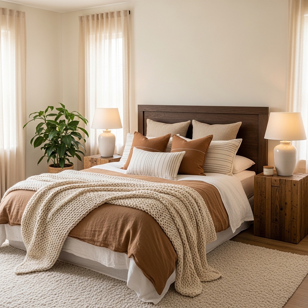 Cream and warm brown tones create a grounded and cozy bedroom environment. Brown adds richness while cream keeps the space light and inviting.