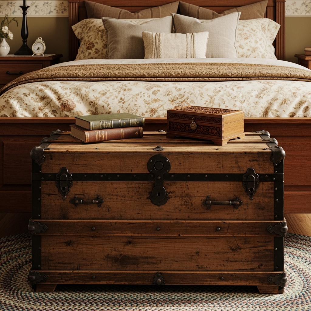 A vintage wooden trunk can serve as both decor and storage in a nostalgic bedroom. These trunks often have rustic textures and antique finishes that add character.