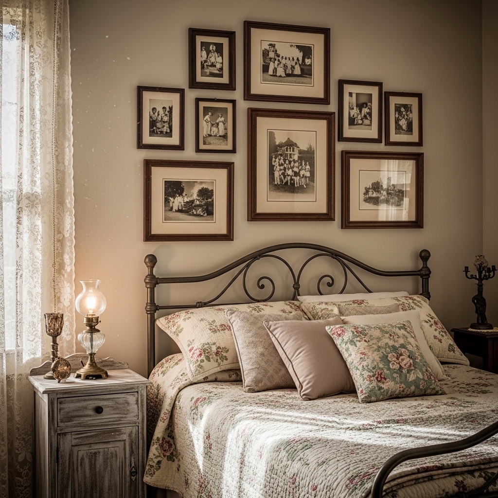 Displaying old family photographs or vintage prints is a meaningful way to create a nostalgic bedroom design. A gallery wall adds personality and tells a story through memories and artwork.