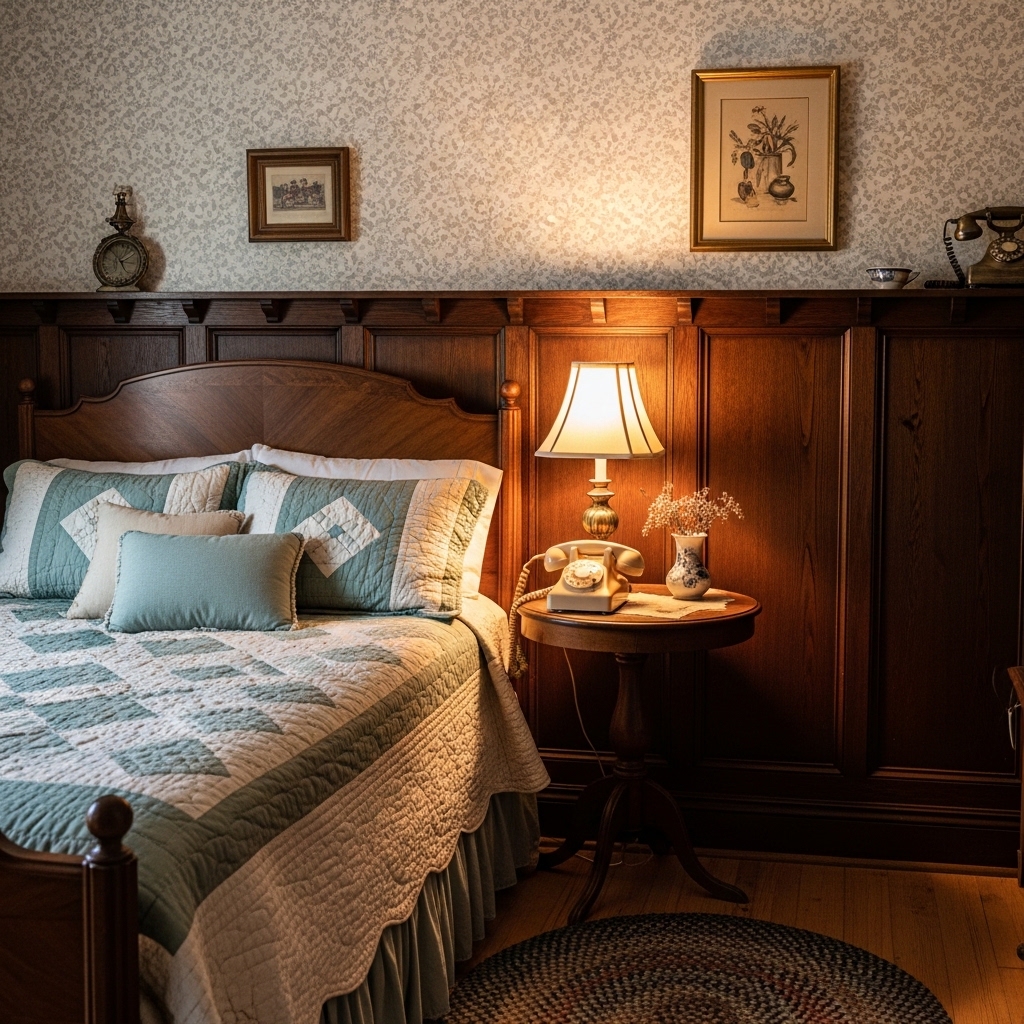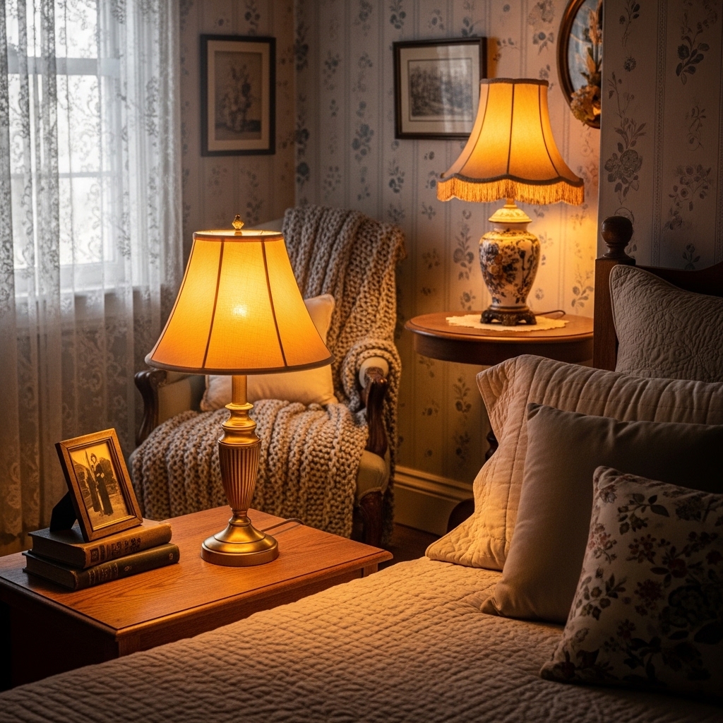 Old-style table lamps with fabric shades can instantly make a bedroom feel nostalgic and cozy. Soft warm lighting creates a relaxing atmosphere while highlighting vintage decor details.