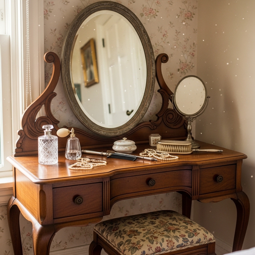 A classic vanity table adds elegance and nostalgic charm to a bedroom. Mirrors with decorative frames and small drawers create a romantic vintage aesthetic.
