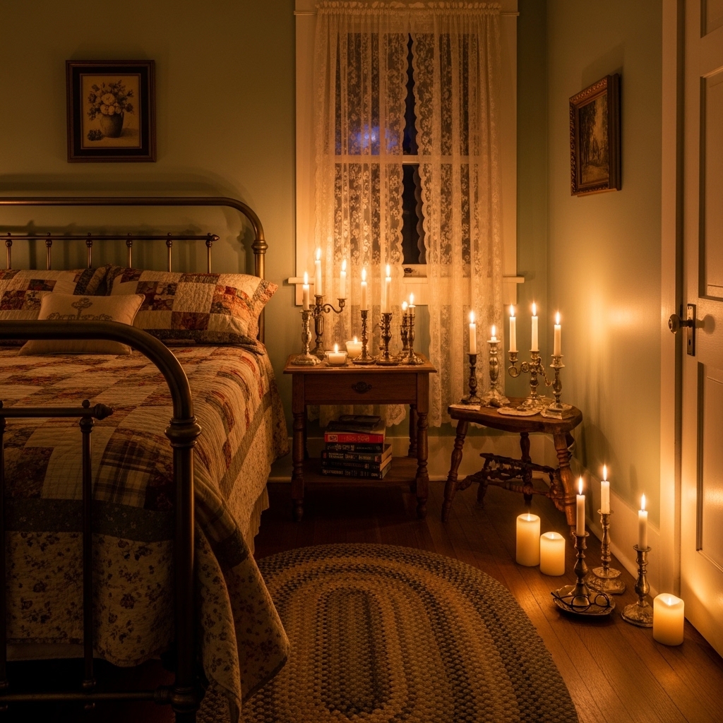 Candles can create a warm nostalgic glow in the bedroom. Soft candlelight enhances relaxation and adds a romantic vintage ambiance.