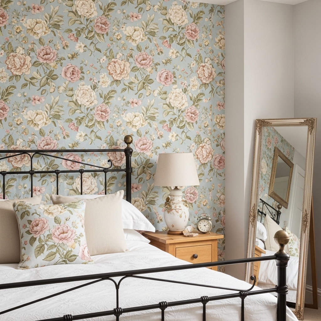 Floral wallpaper instantly creates a nostalgic and vintage-inspired bedroom atmosphere. Soft patterns with roses, daisies, or botanical prints bring classic charm and romantic character to the space. This design works especially well behind the bed to create a beautiful focal point.