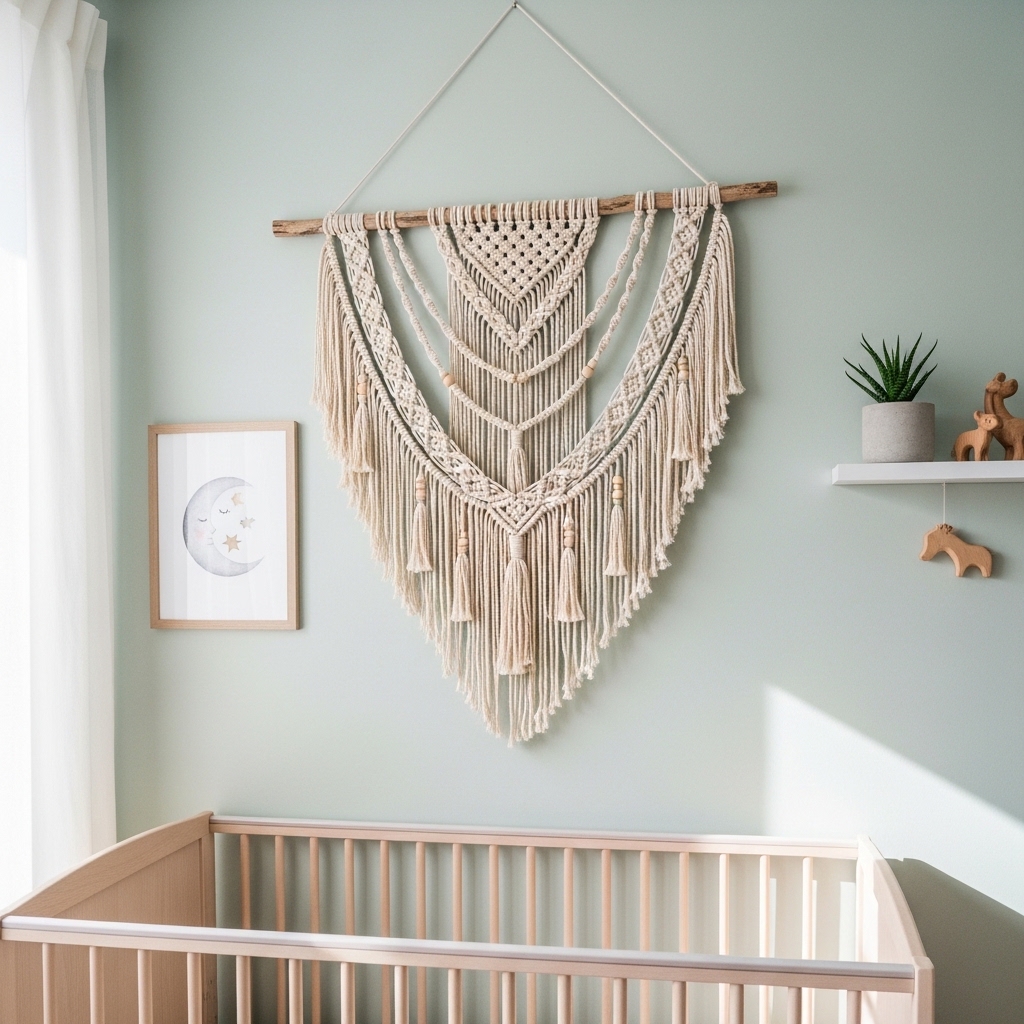 Mistake to Avoid: Do not hang macrame within reach of your crib. Babies pull on hanging ropes dangerously.