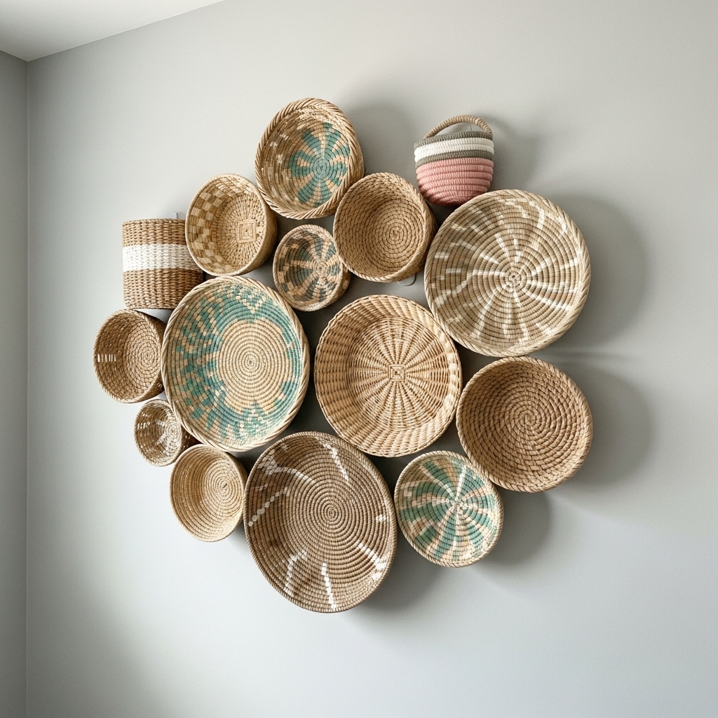 Hang five to seven woven baskets in different sizes on one wall. Arrange them in an organic cluster.
