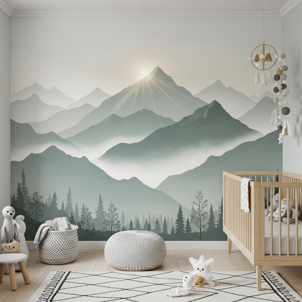 The mountains add depth and calm to your nursery. The neutral colors match any future decor changes.