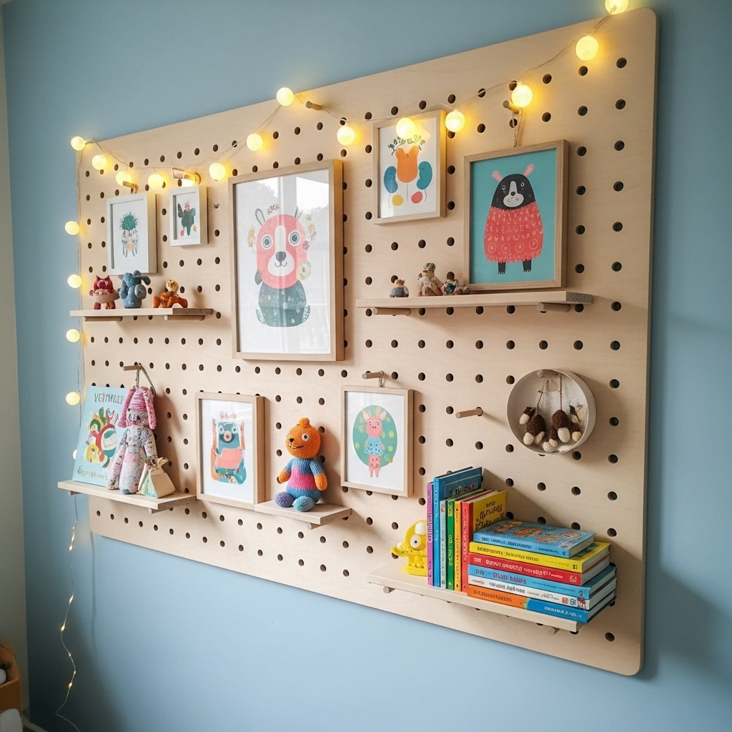 Mount a large pegboard on one wall. Add clips, small shelves, and hooks for hanging art.