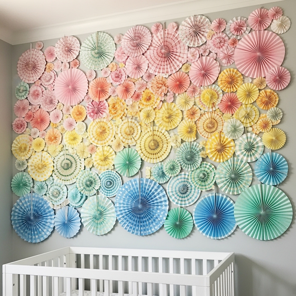 Paint a single circle behind the crib. Hang a macrame piece. Install floating shelves. Add paper fans in a gradient.