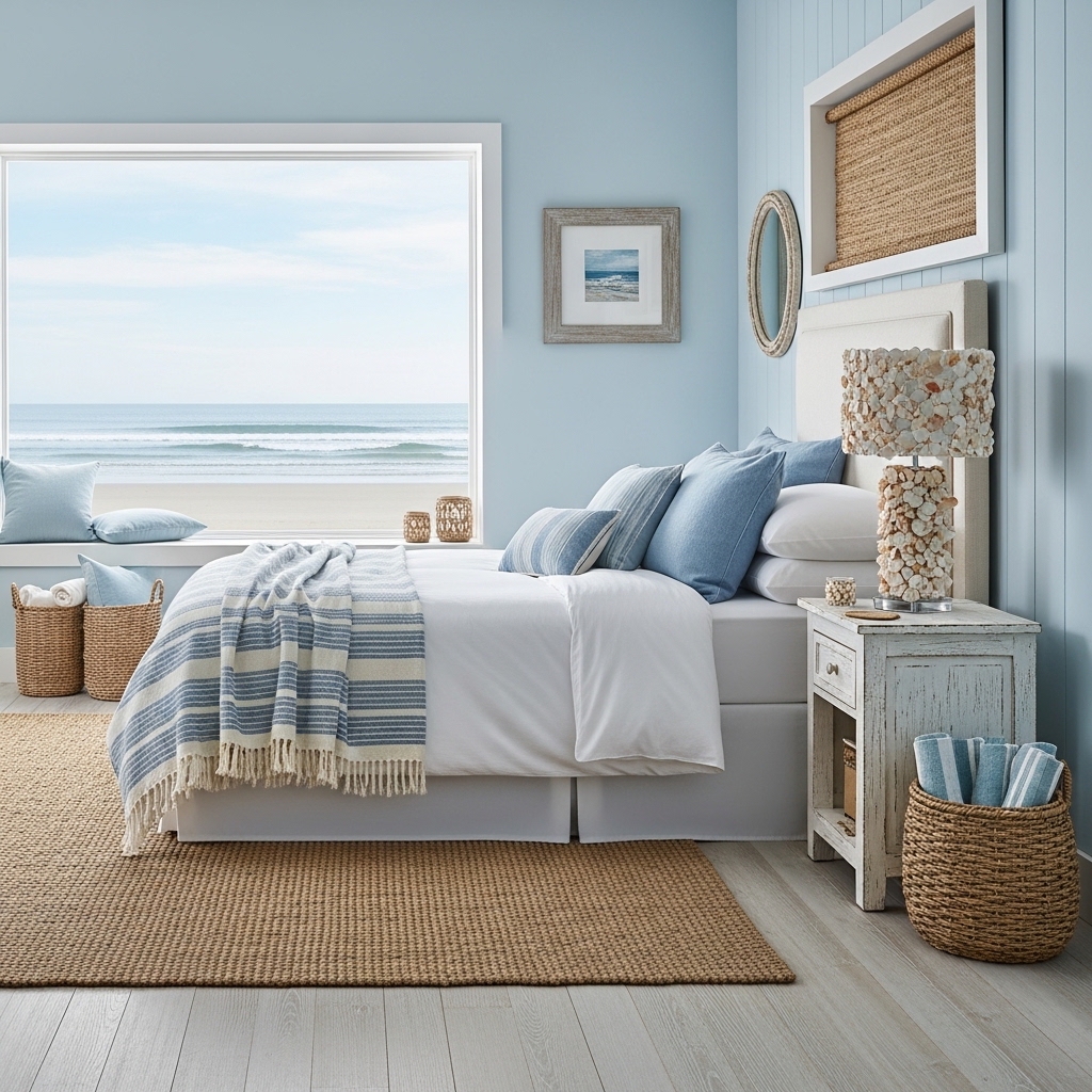Pro Tip: Add striped pillows or light linen curtains to reinforce the coastal vibe.