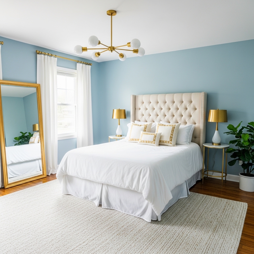 4. Powder Blue Bedroom with Gold Accents