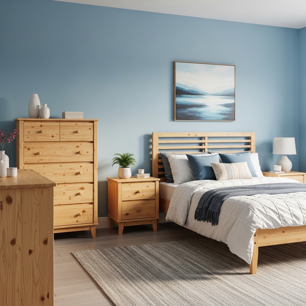 Light oak or maple furniture pieces help balance the cool tones of powder blue walls or bedding.