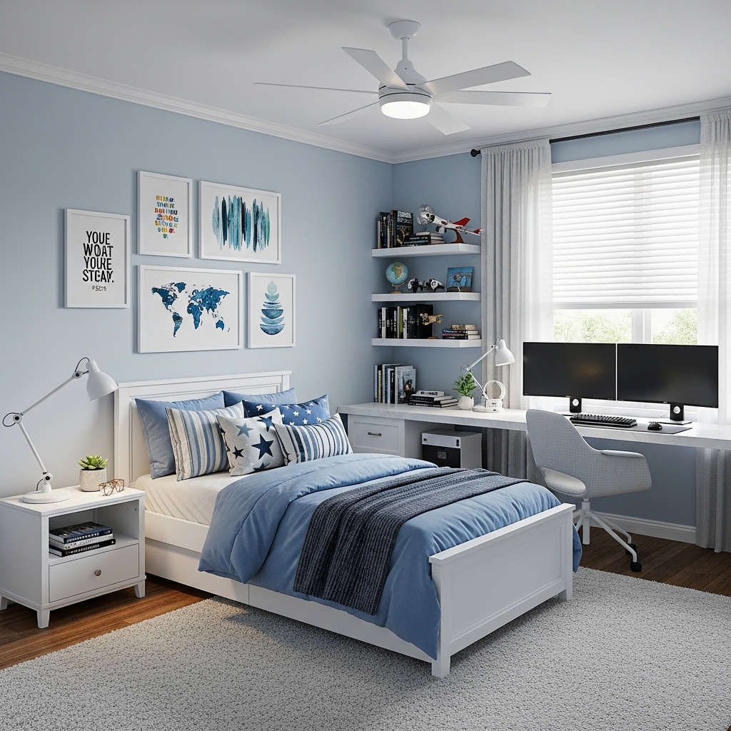 Pairing powder blue walls with playful decor, colorful cushions, or creative wall art makes the room feel youthful and fun.