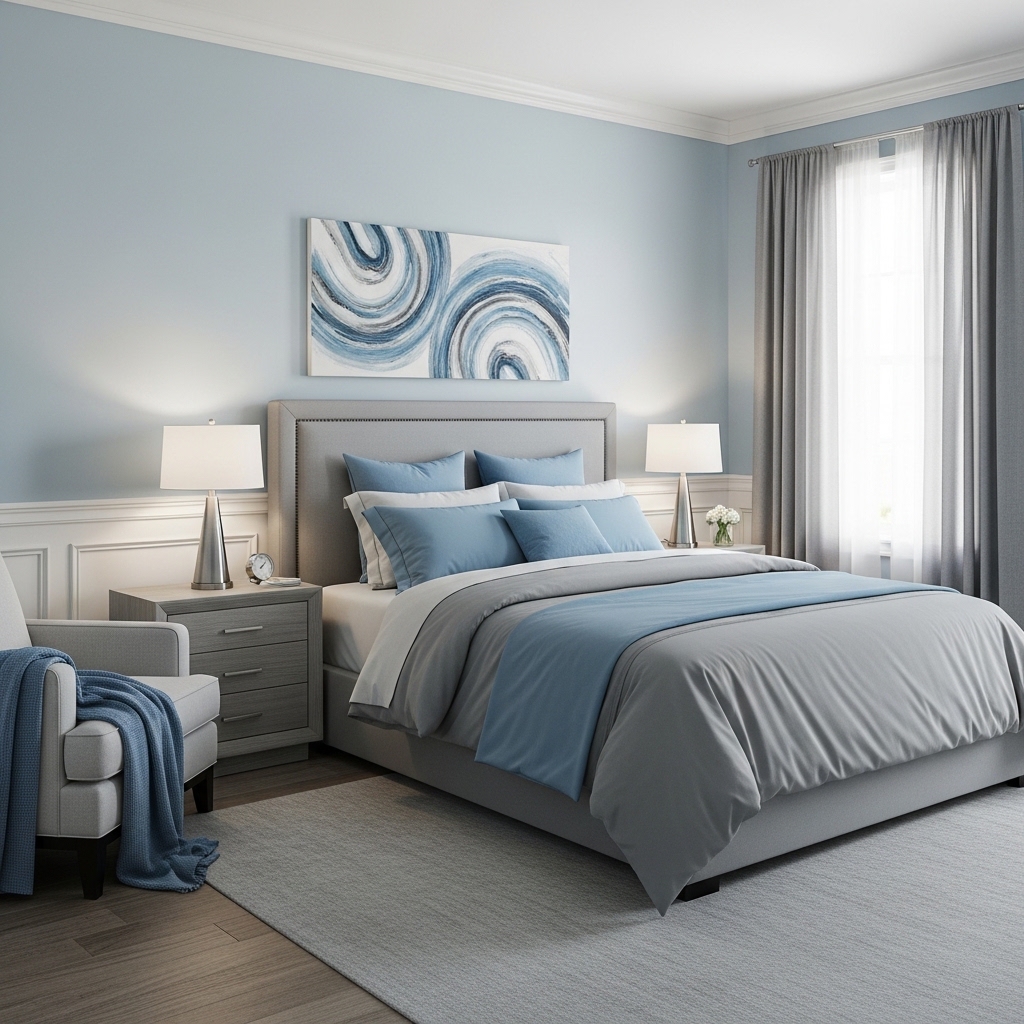 5. Powder Blue and Gray Bedroom Design