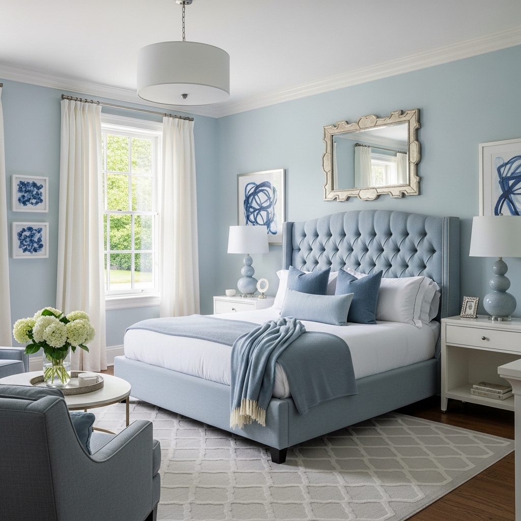 This color works beautifully with many interior styles including modern, coastal, Scandinavian, and classic bedroom designs. Because powder blue is a light shade, it also helps small bedrooms appear more spacious and open.