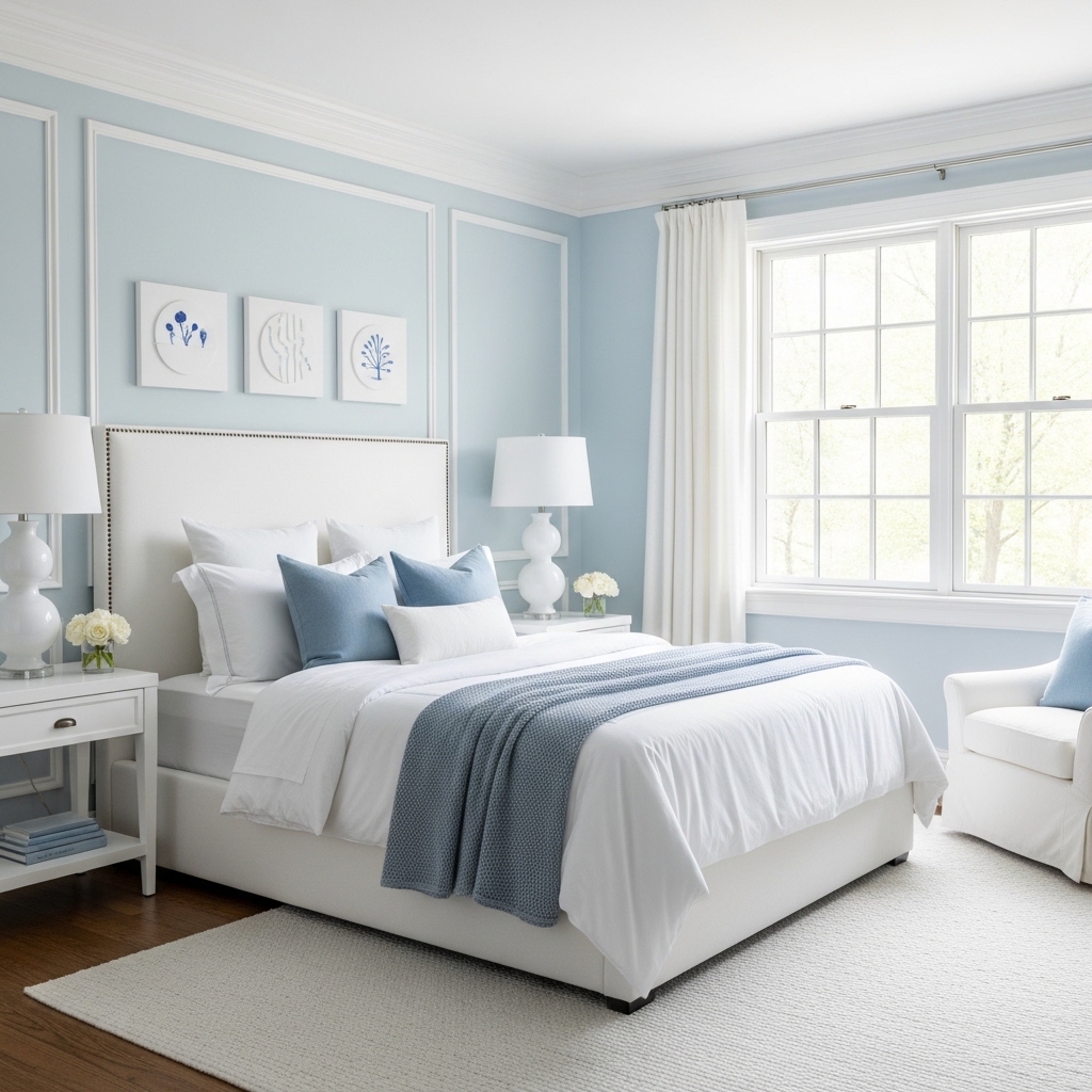 Combining powder blue with crisp white creates a timeless and refreshing bedroom color scheme. White walls brighten the room while powder blue accents add soft color.