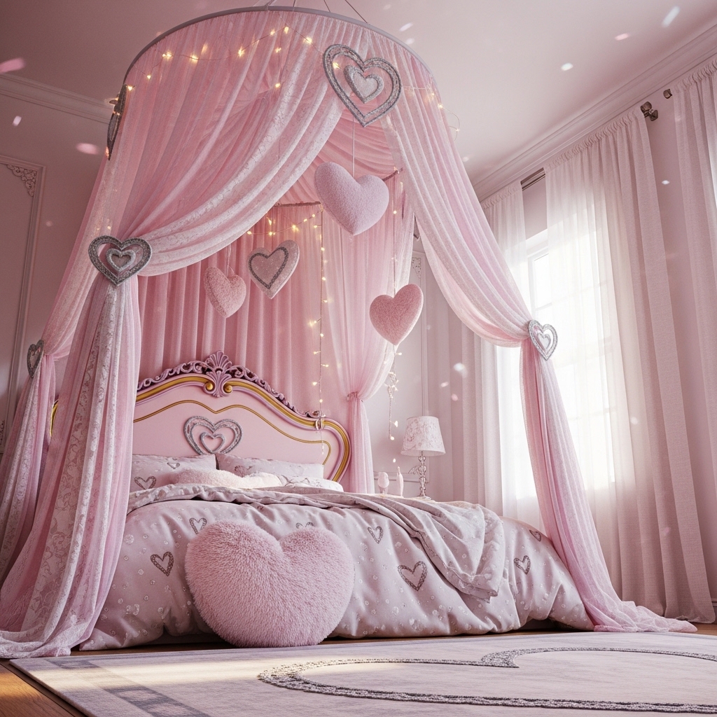 A canopy bed instantly gives a bedroom a royal princess atmosphere. Adding sheer curtains decorated with small hearts creates a dreamy sleeping space that feels cozy and magical.