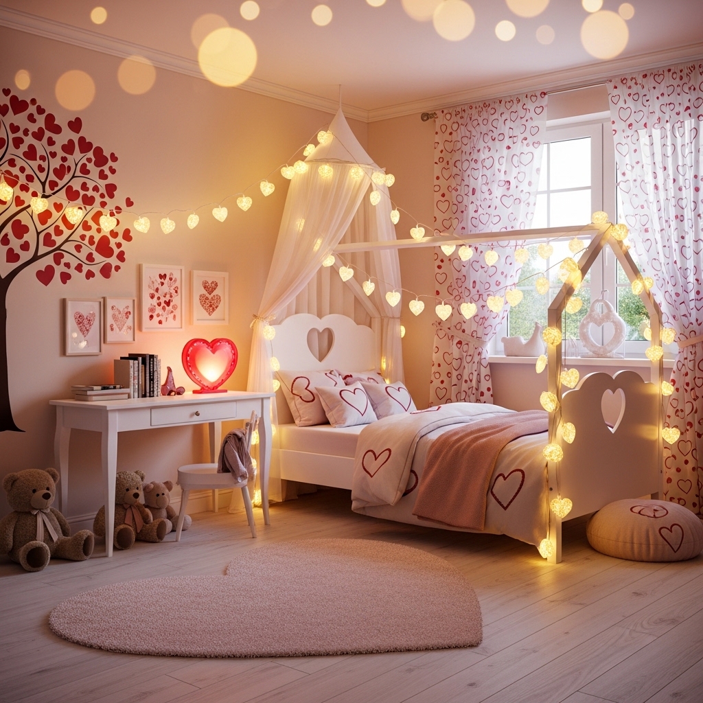 Heart-shaped string lights are a simple way to add a magical glow to a princess bedroom. These lights can be draped across the headboard, along shelves, or around windows.