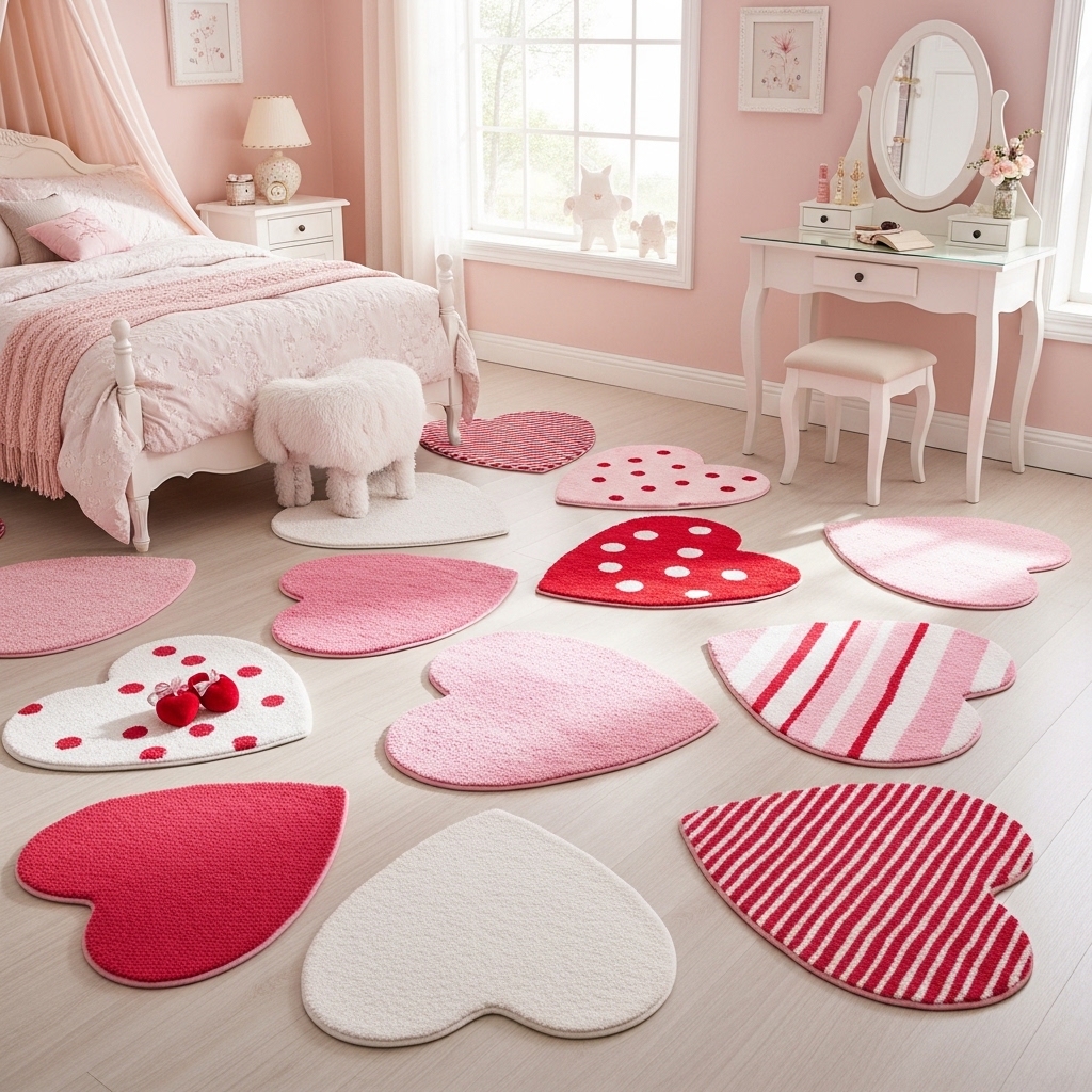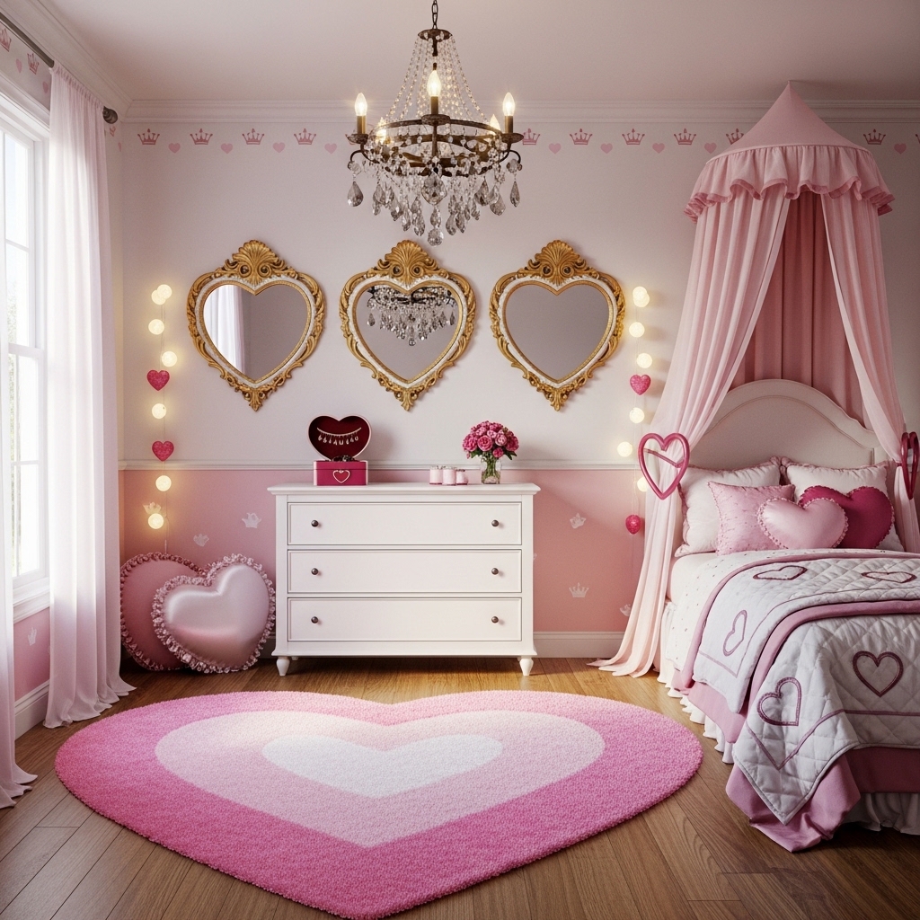 A heart-shaped rug adds warmth and softness to the bedroom floor while reinforcing the theme. Placing the rug near the bed or play area creates a comfortable spot for reading or playing.