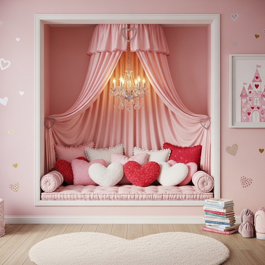 Designing a heart themed princess bedroom for girls is a way to make a room that is full of imagination and comfort. You can make this room special by using heart shaped things, soft colors, cozy things to touch and furniture that looks like it is from a story.