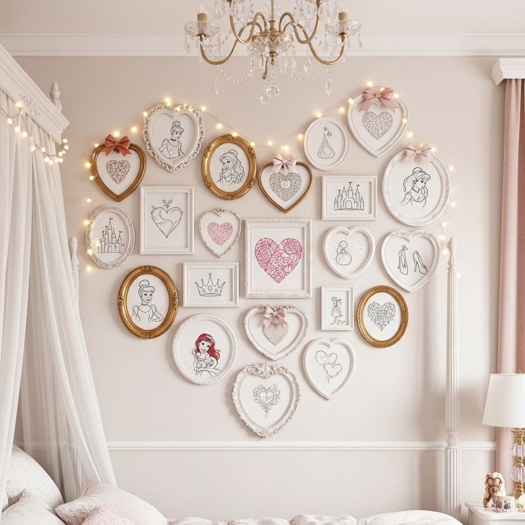 A heart-themed gallery wall adds personality and creativity to a princess bedroom. You can include framed heart illustrations, fairy-tale quotes, princess artwork, or photos.