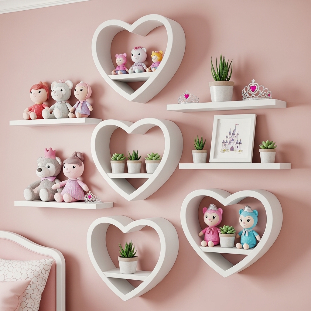 Heart-shaped wall shelves combine decoration with practical storage. These shelves can hold toys, books, or decorative items while adding a playful element to the wall.