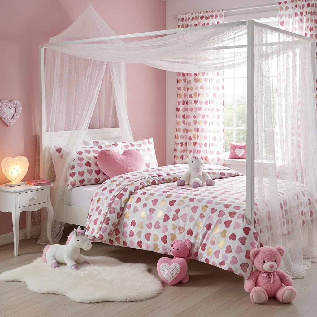 Bedding plays a major role in defining the style of a bedroom. Heart-patterned sheets, comforters, and pillowcases instantly enhance the princess theme while keeping the bed cozy and inviting.