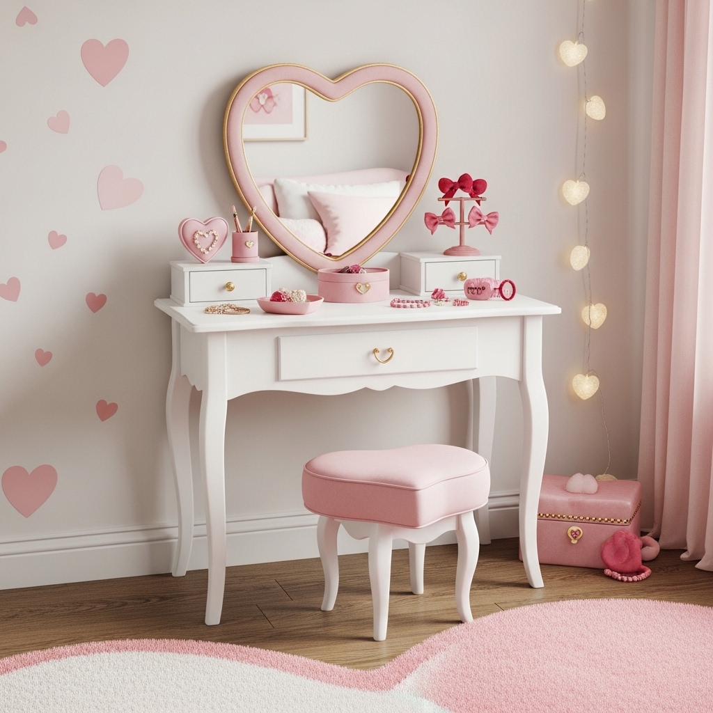 A small table with a heart-shaped decoration can make my bedroom feel like a princesss dressing room. I can add a little stool a pretty mirror and some small boxes to store my stuff. That way I have an useful space.
