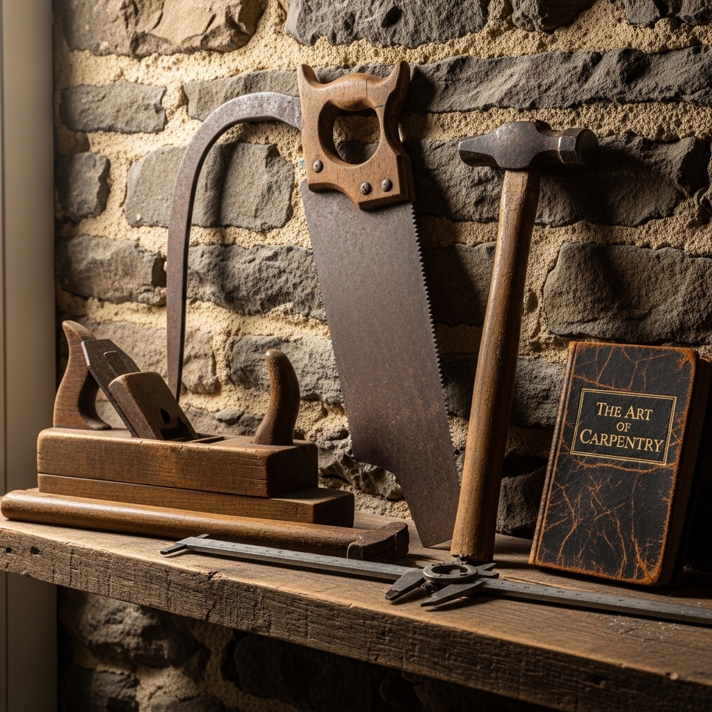 Arrange vintage planes, saws, and levels on a wall. The wood should be worn. The steel should be rusted.