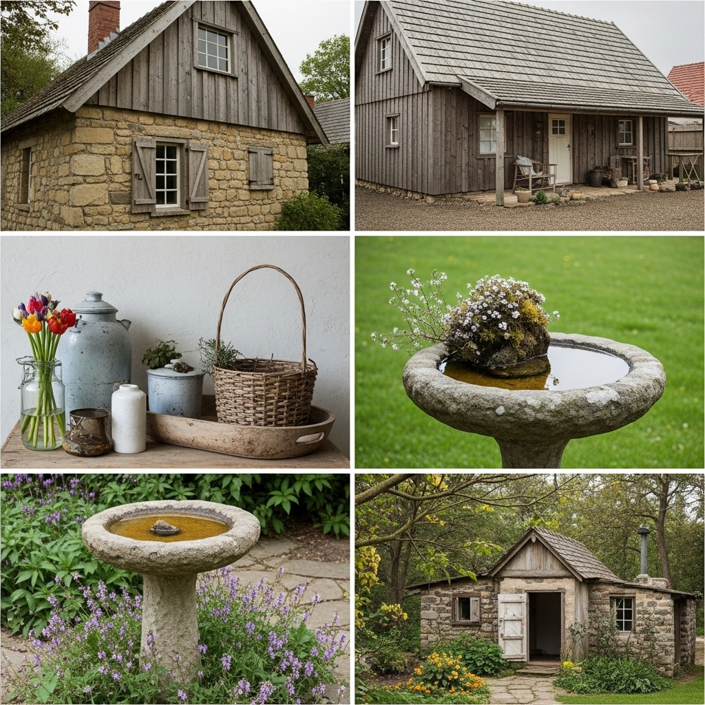 Rustic cottage decor celebrates raw materials. Reclaimed wood shelves. Exposed stone fireplaces. Live-edge coffee tables. Wrought iron sconces. Wooden buckets by the door. Slate floors. Barn doors. Wooden bowl collections. Rough-hewn ceiling beams. Cast iron kettles. Woven rag rugs. Log cabin side tables. Vintage hand tools. Stone mortar and pestles. Copper lanterns. Wooden spool tables. Antler sheds. Stone birdbaths. Blacksmith hooks. Wooden breadboards.