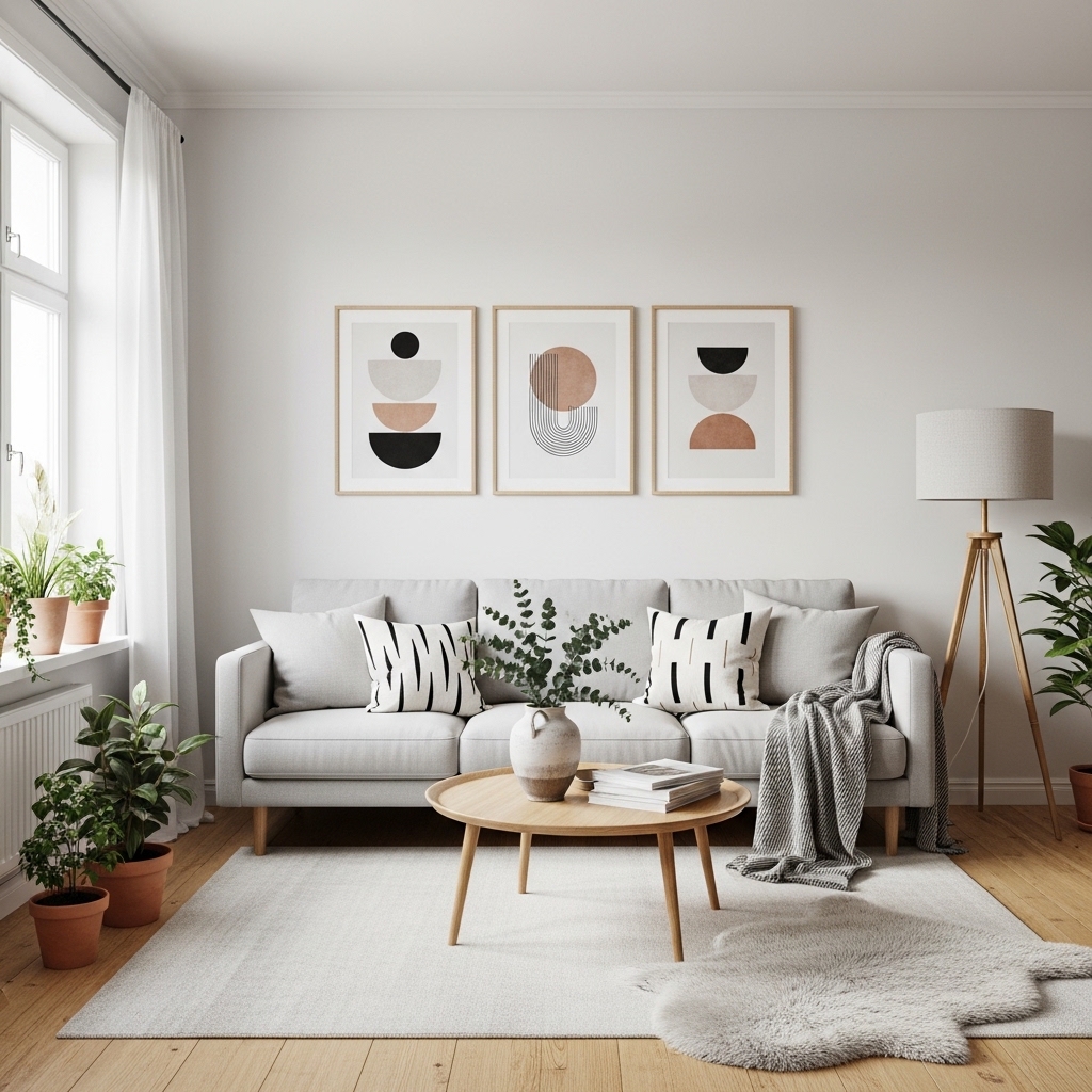 Art in Scandinavian interiors is minimal and intentional. Black-and-white photography, abstract prints, or muted landscape artwork works best.