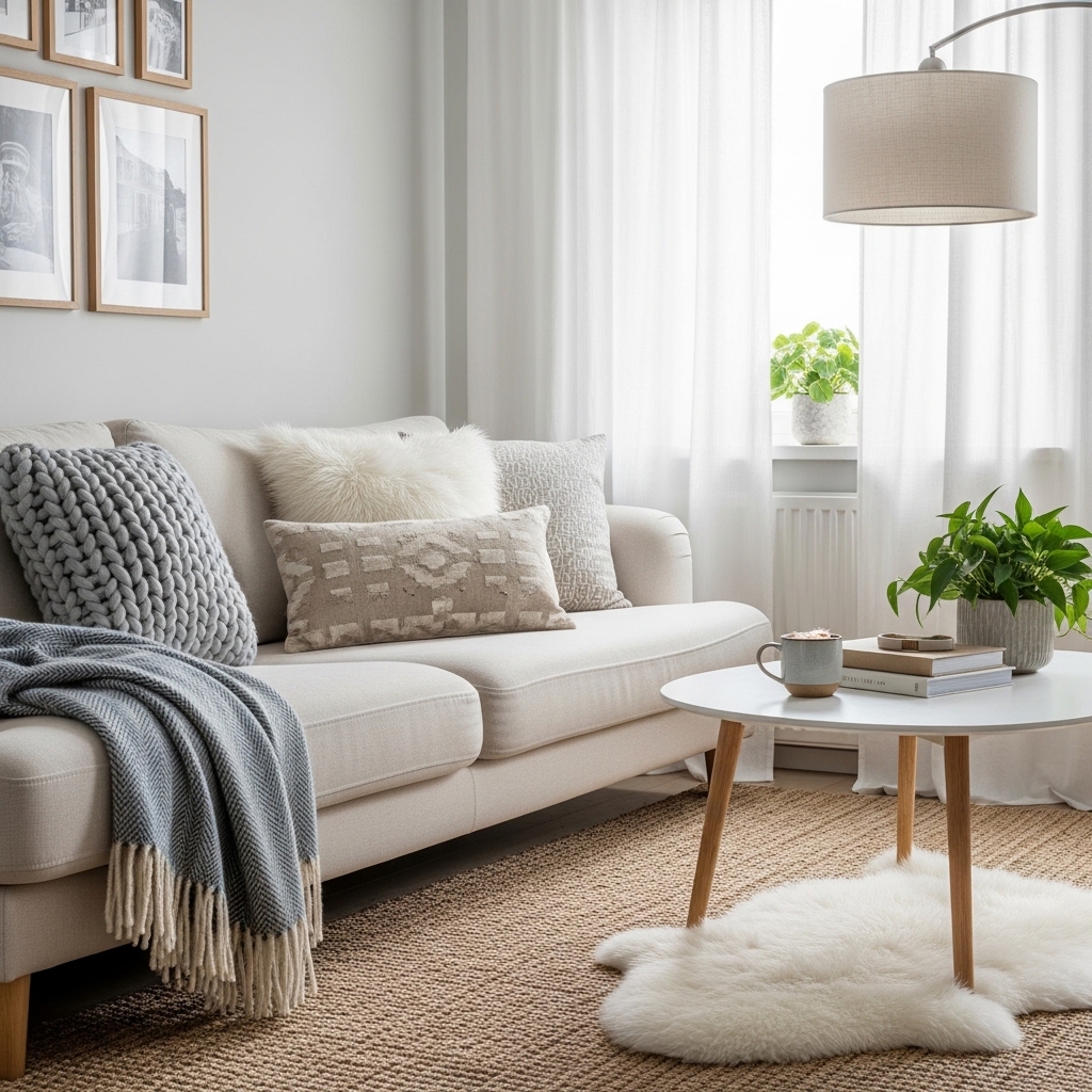 Scandinavian spaces are known for hygge, a sense of cozy comfort. Layering textures through wool throws, knitted cushions, sheepskin rugs, and linen upholstery adds warmth and depth.