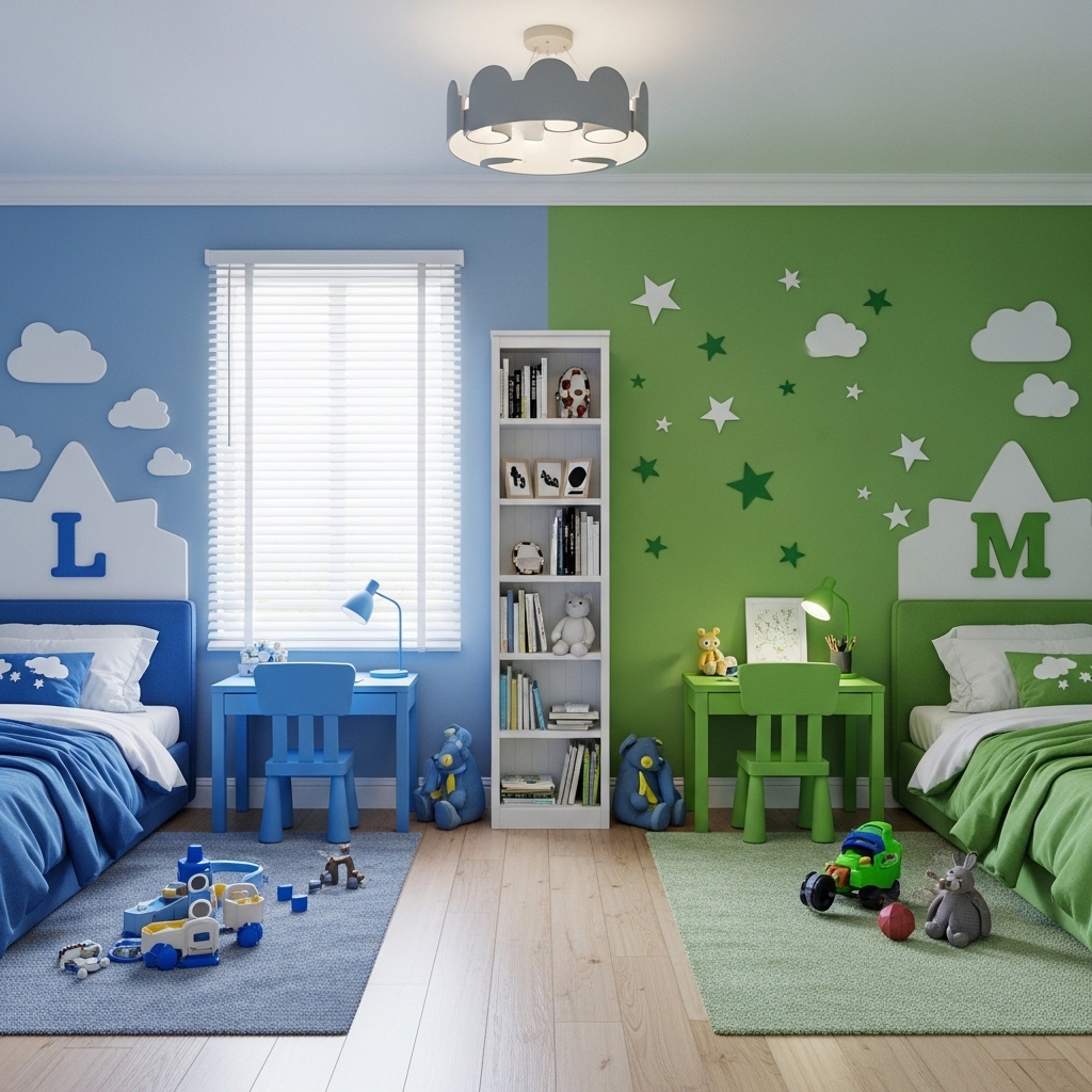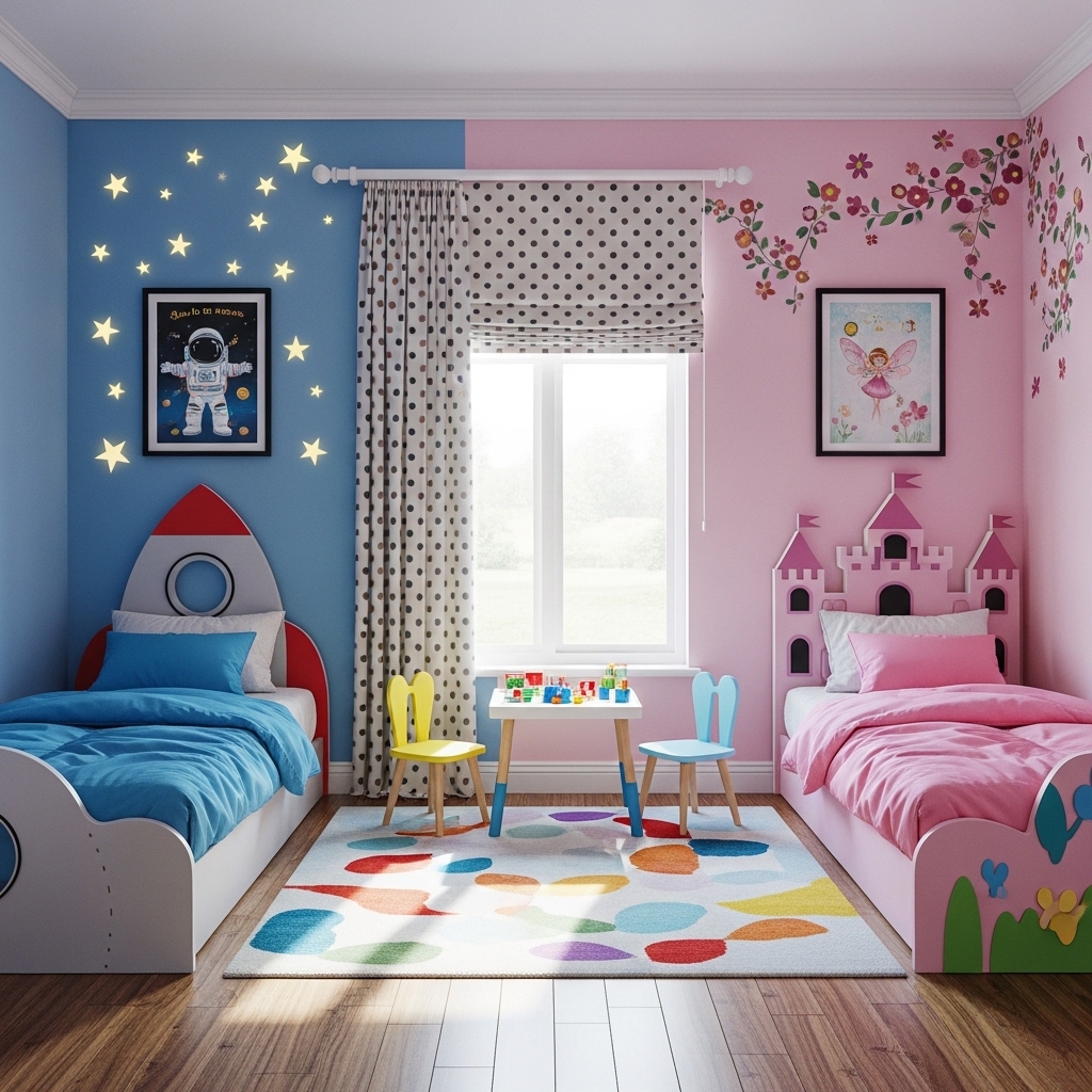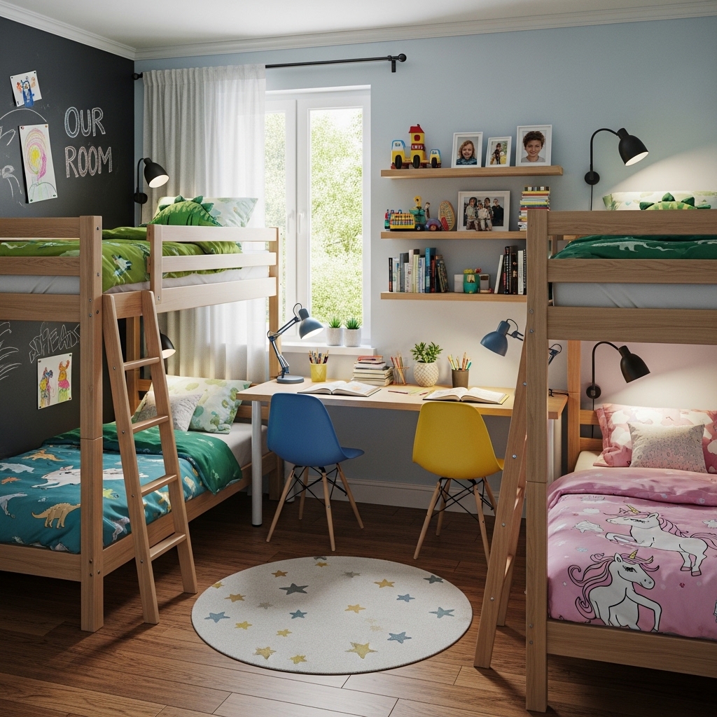 Pro Tip: Use removable wall decals or accent pillows in different colors to personalize each child’s side of the room.