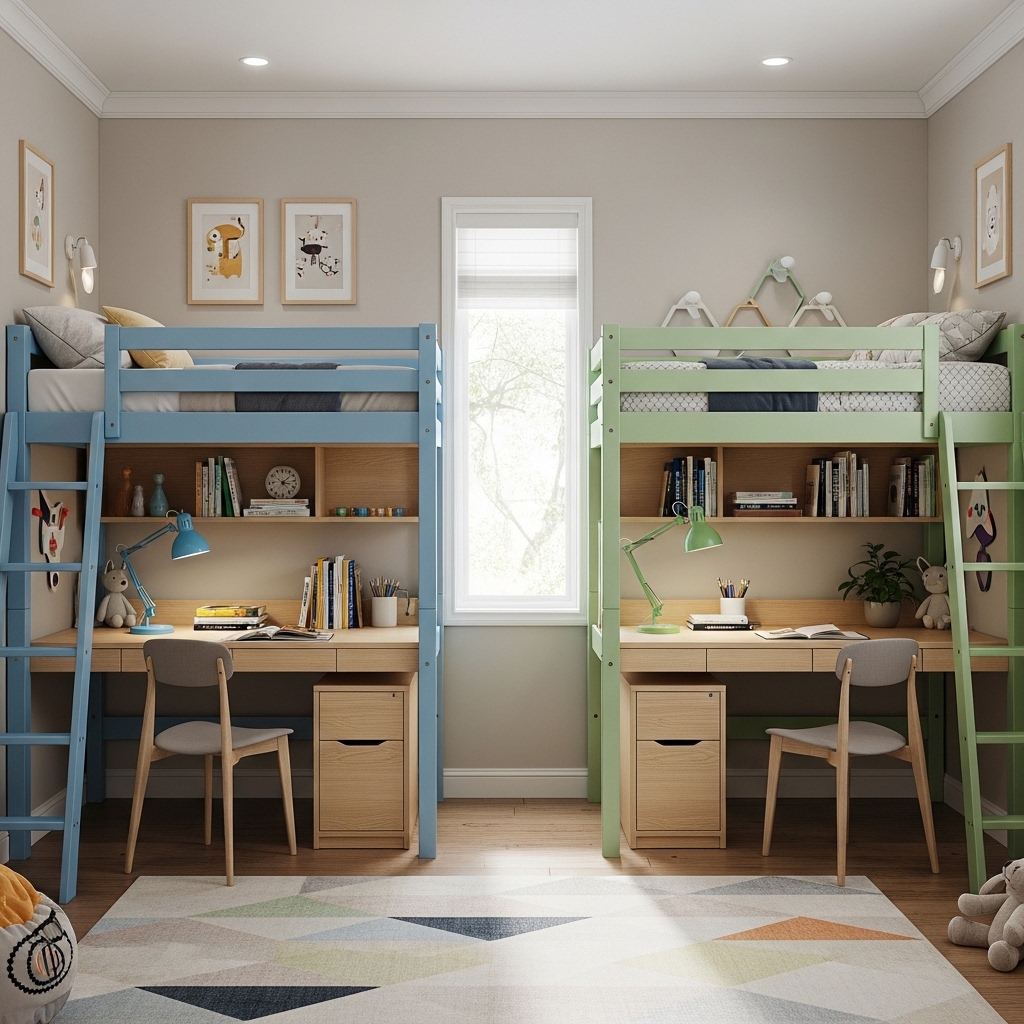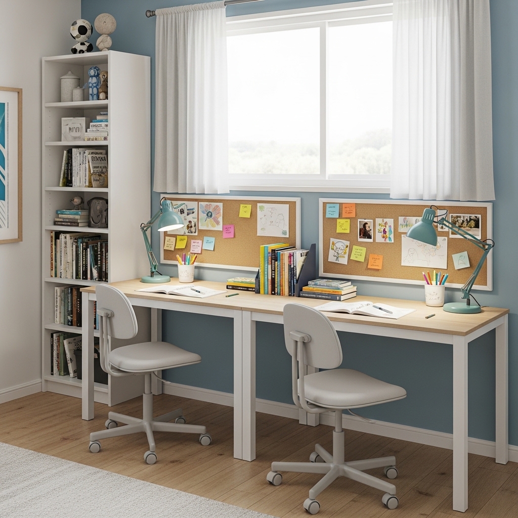 A shared study desk is ideal for school-aged siblings who need a quiet place for homework or creative projects. Long desks or built-in study stations allow both children to work comfortably side by side.