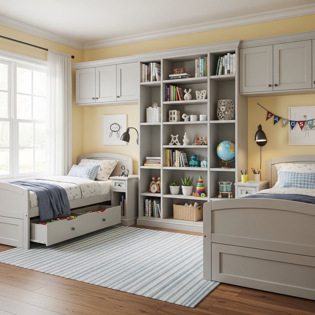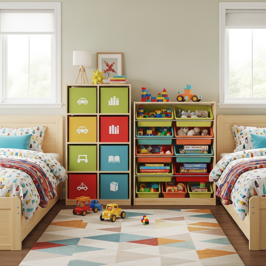 Storage cubes and toy organizers keep shared bedrooms tidy and easy to manage. Modular cube shelves allow toys, books, and clothes to be sorted into individual sections for each child.