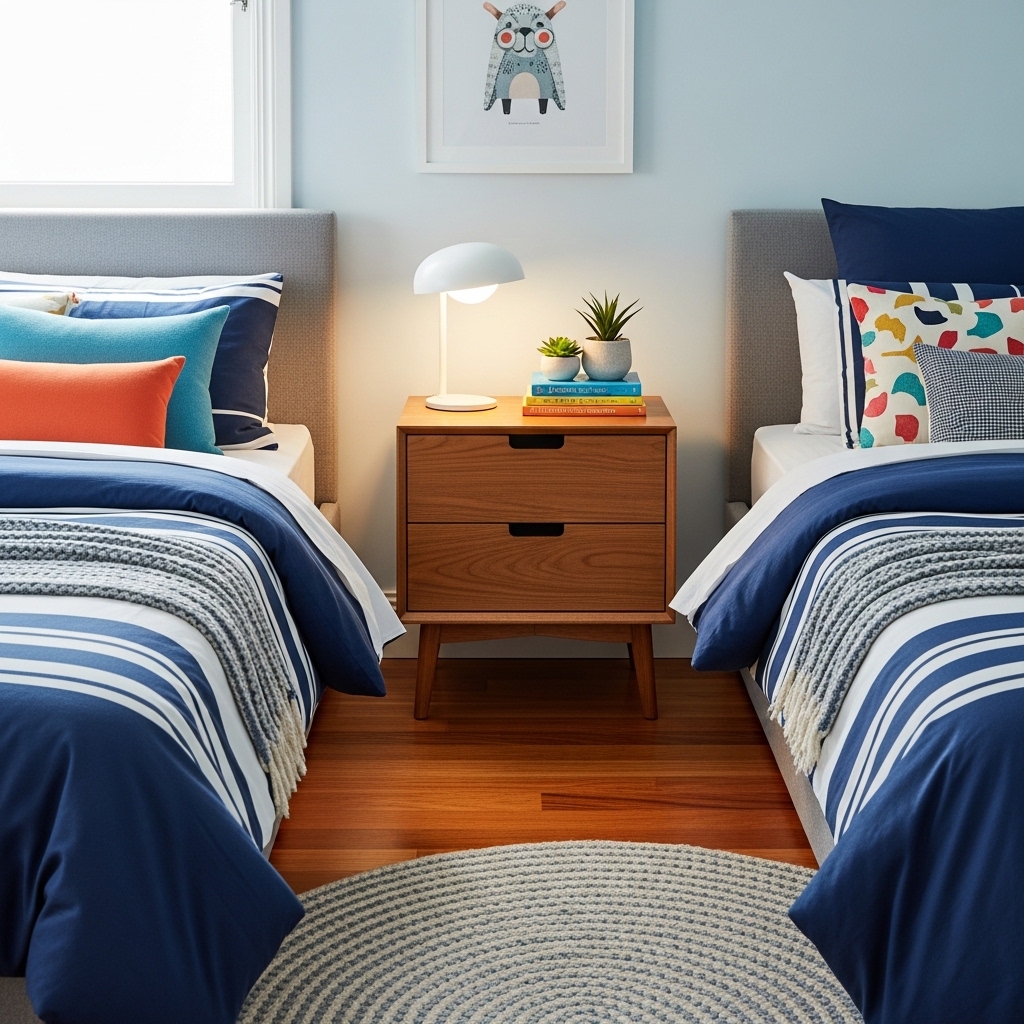 A shared nightstand between the beds provides space for lamps, books, or small personal items. It also helps maintain an organized and cohesive room design.