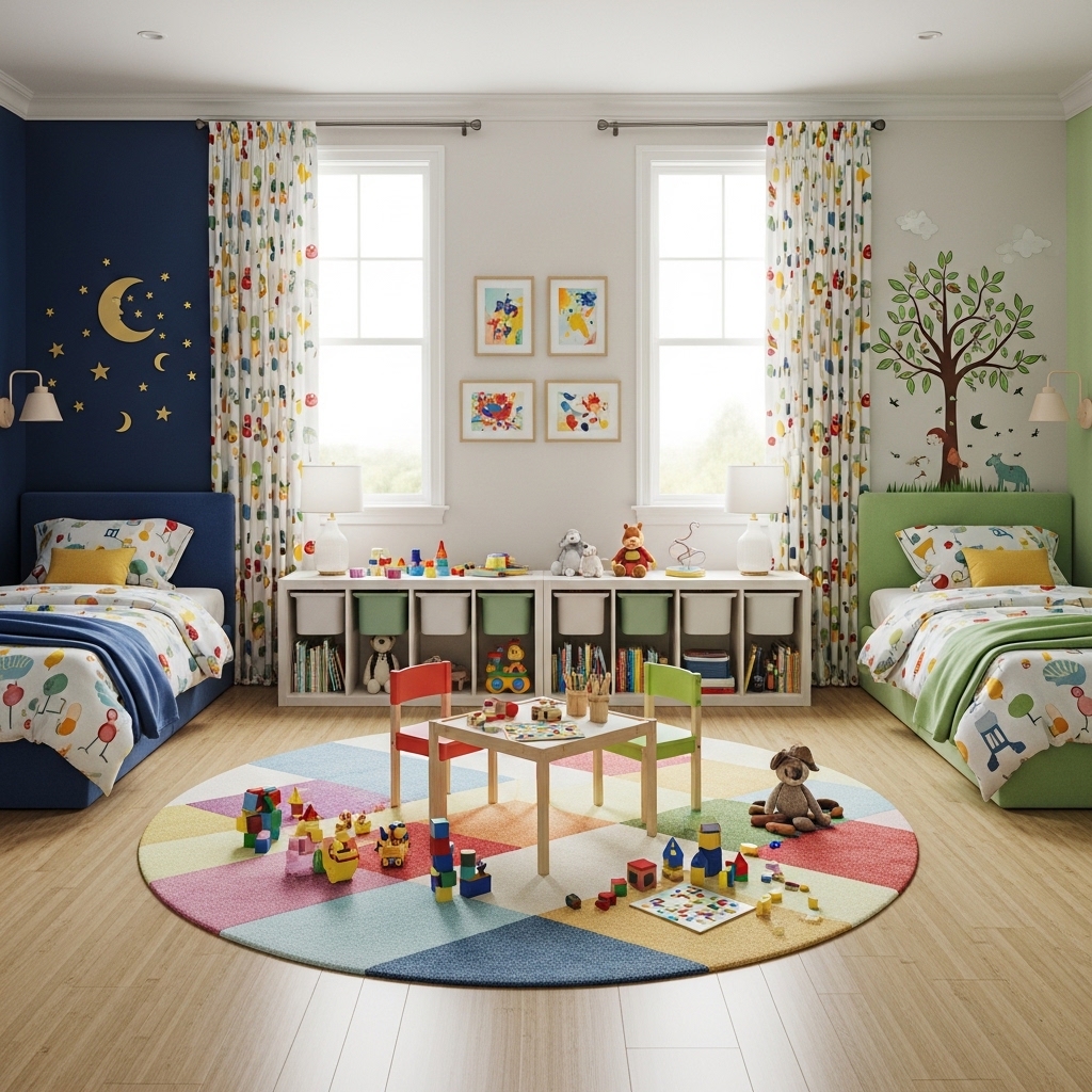 Soft rugs, storage baskets, and toy organizers can help define the play zone while keeping the rest of the room neat. This layout also prevents toys from spreading across sleeping areas.