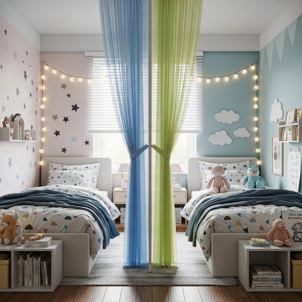 Curtain dividers are a simple yet effective way to provide privacy in a shared bedroom. Hanging a curtain between beds or along a bunk bed creates personal zones when needed.