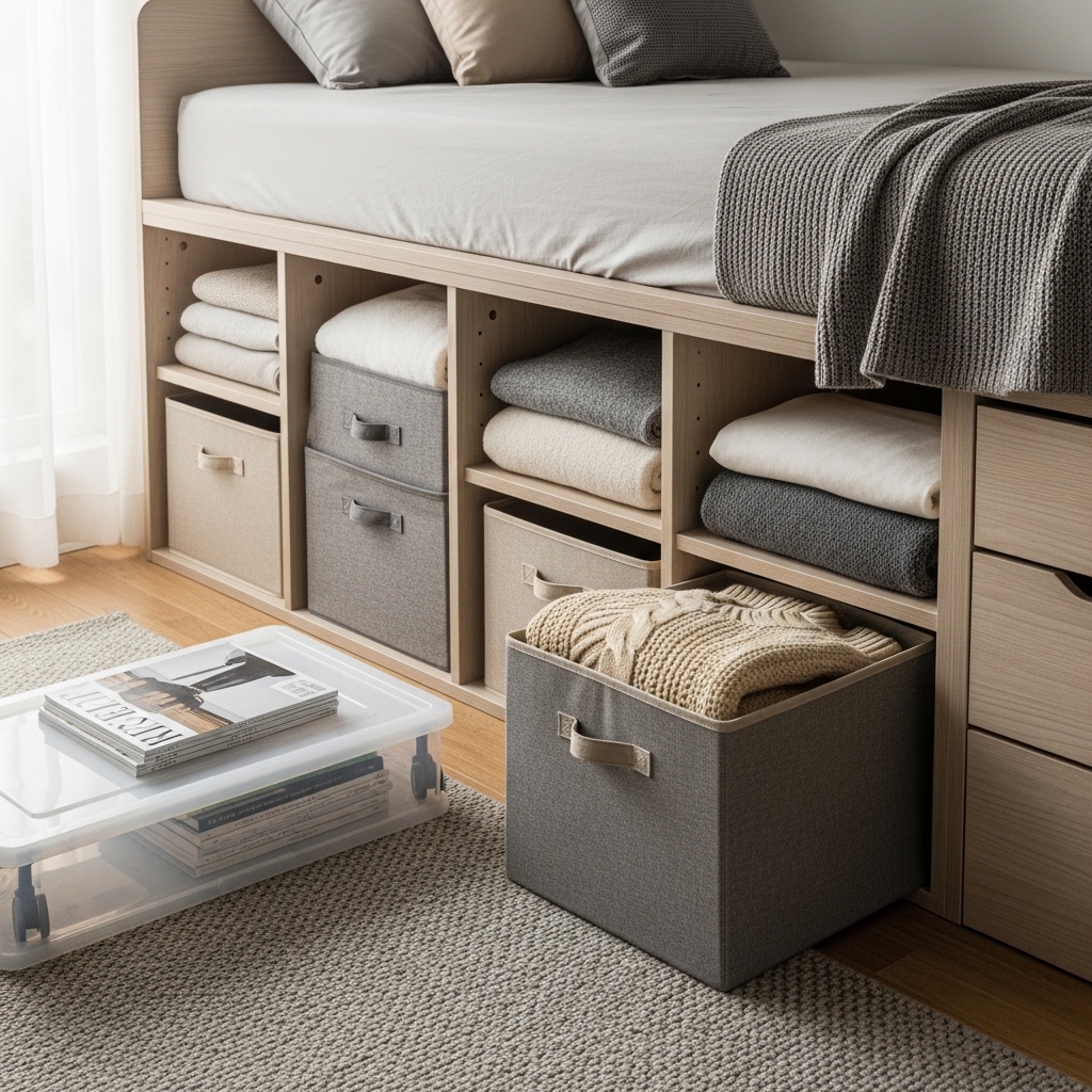 Store items like seasonal clothing or extra bedding under the bed using structured containers. Keep everything labeled and easy to access.