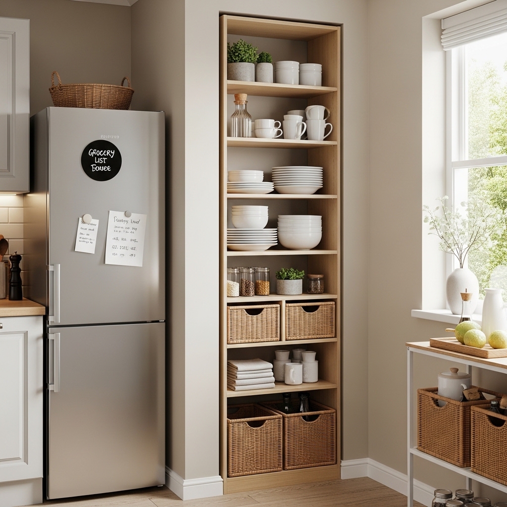 Install narrow shelves or cabinets in unused slim spaces. Keep them proportionate to the area.