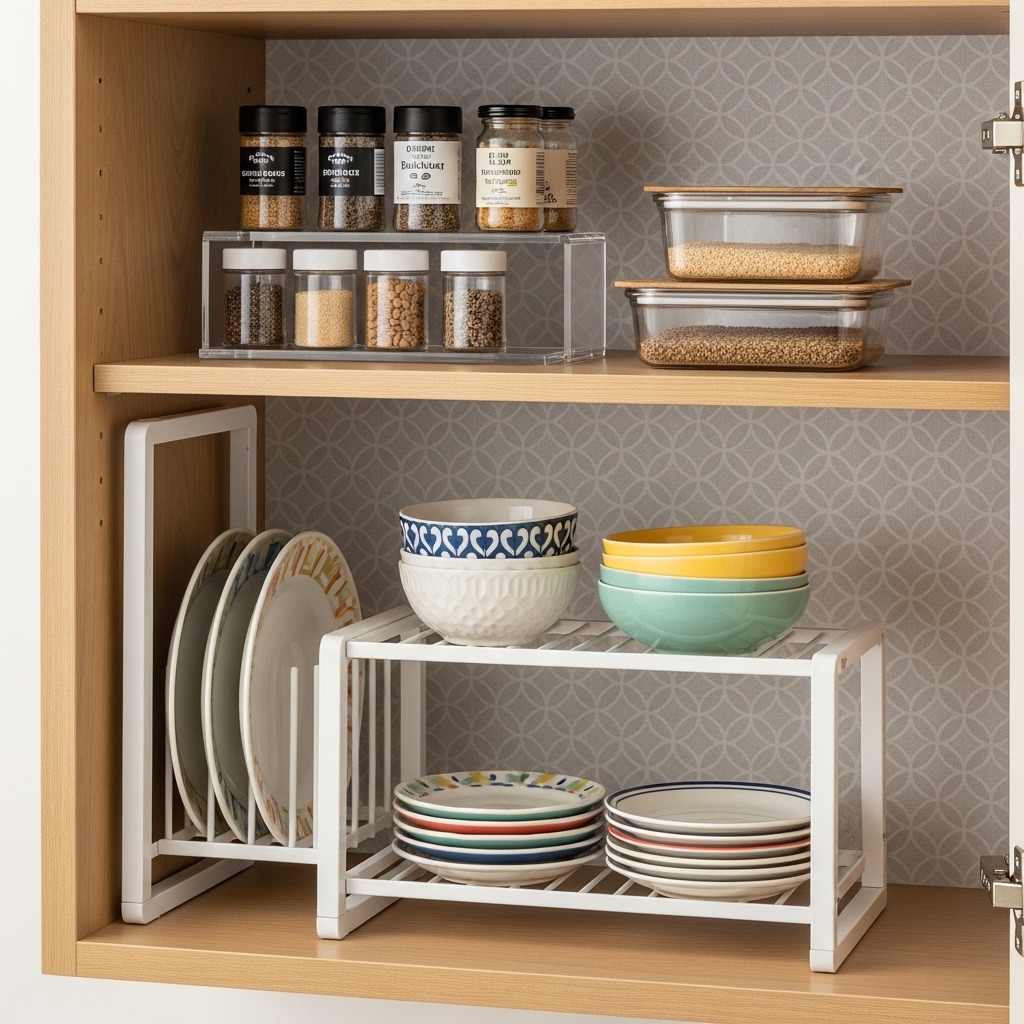 Use stackable organizers or shelf risers inside cabinets to create multiple levels of storage.