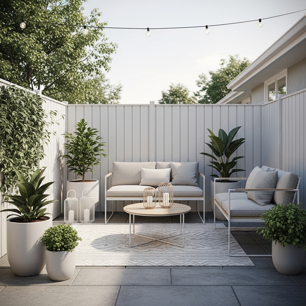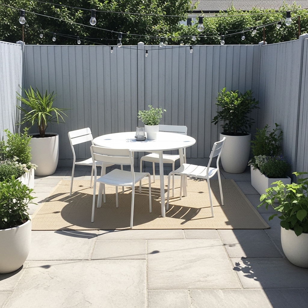 Use a weather-resistant rug to anchor your seating or dining area. Keep proportions aligned with furniture size.