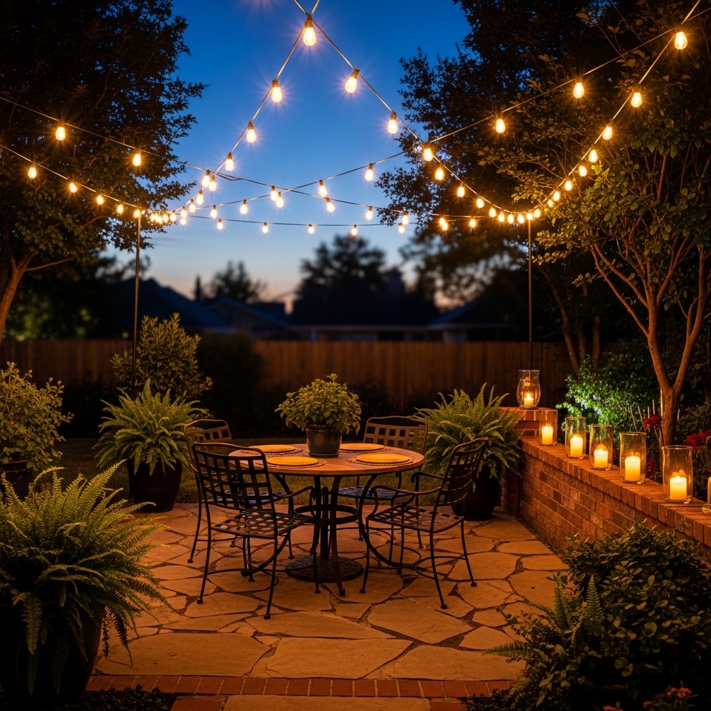 Install string lights above seating areas to create a defined, cozy atmosphere. Keep placement intentional.