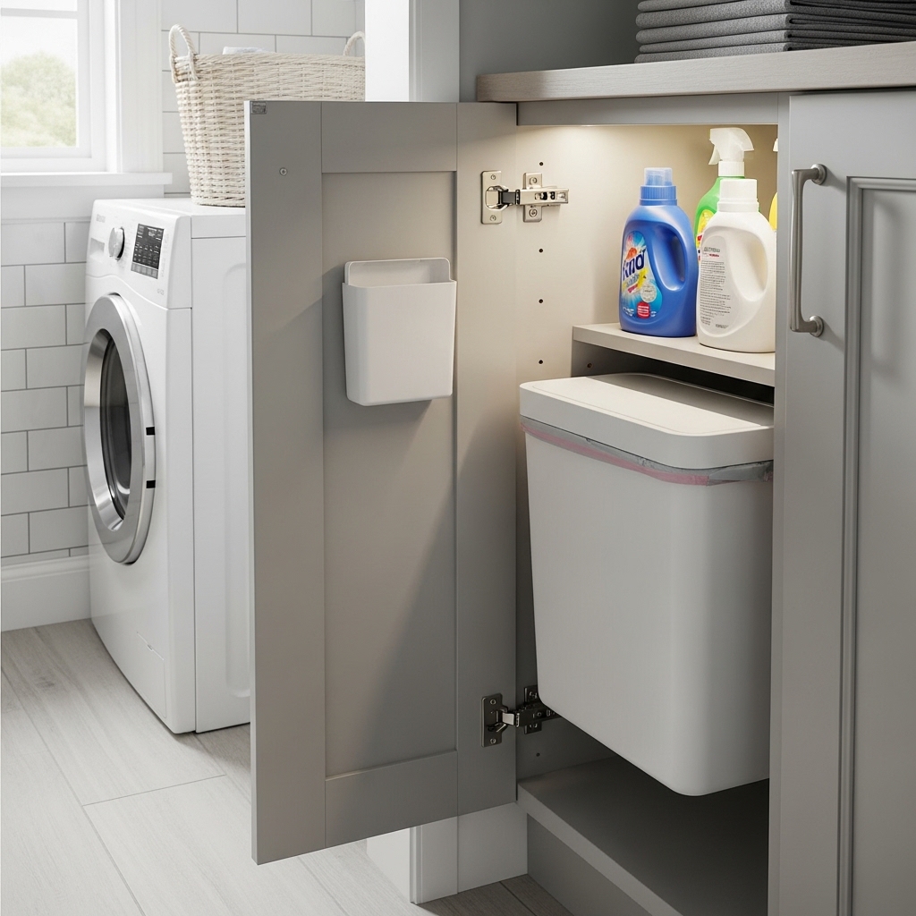 Floor space is too valuable in a small laundry room to waste on a trash can.