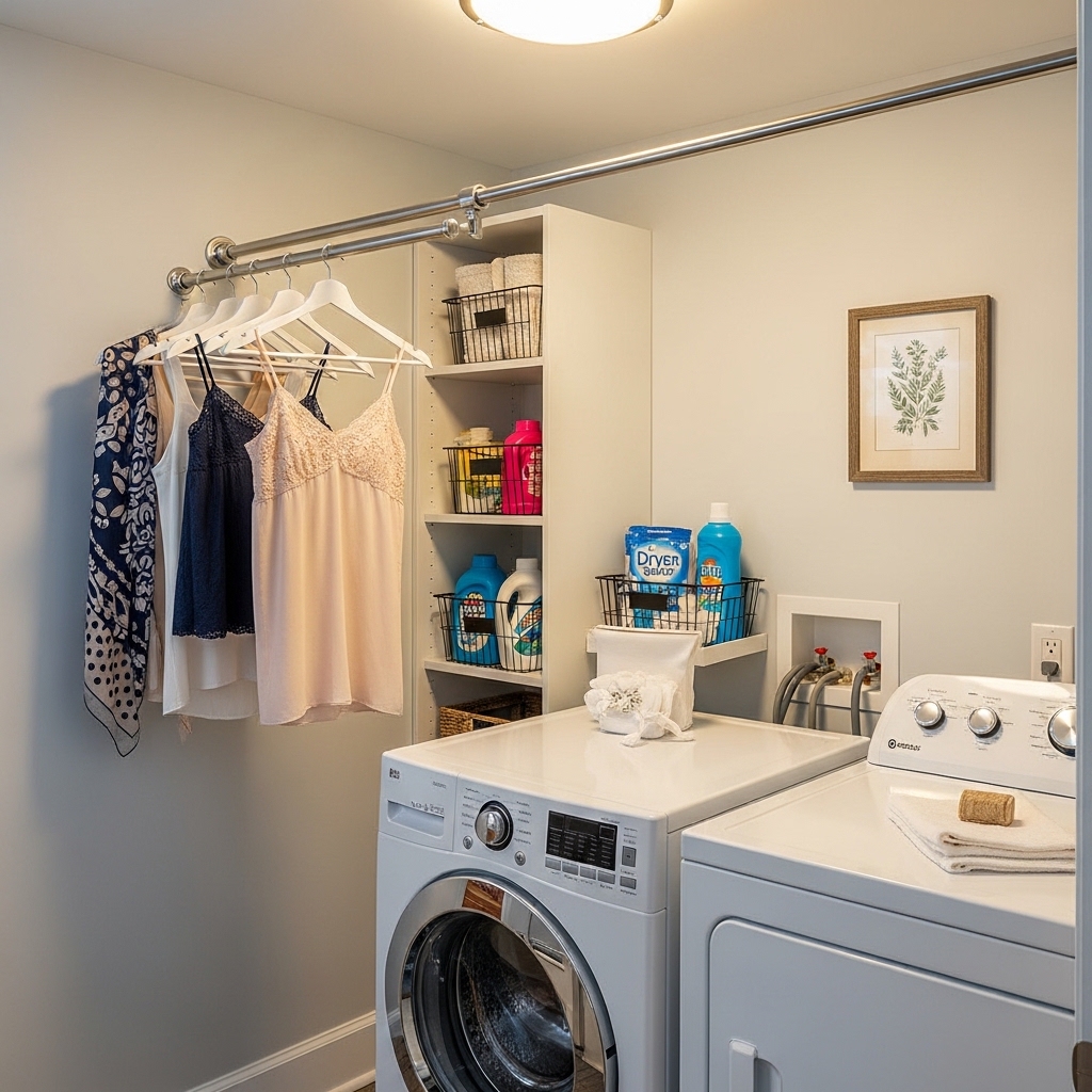 Add small shelves for stain removers, wool dryer balls, and mesh laundry bags.