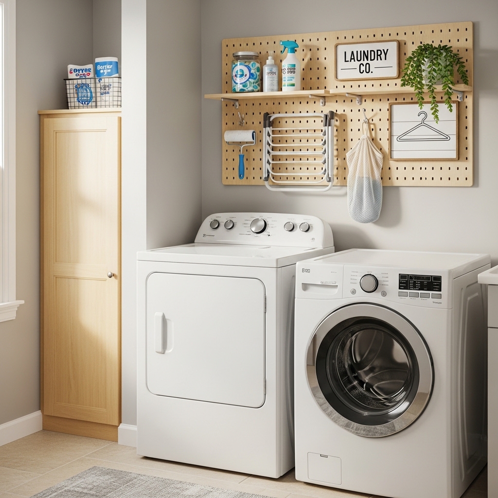 A pegboard turns wasted wall space into flexible, customizable storage for all your laundry tools.