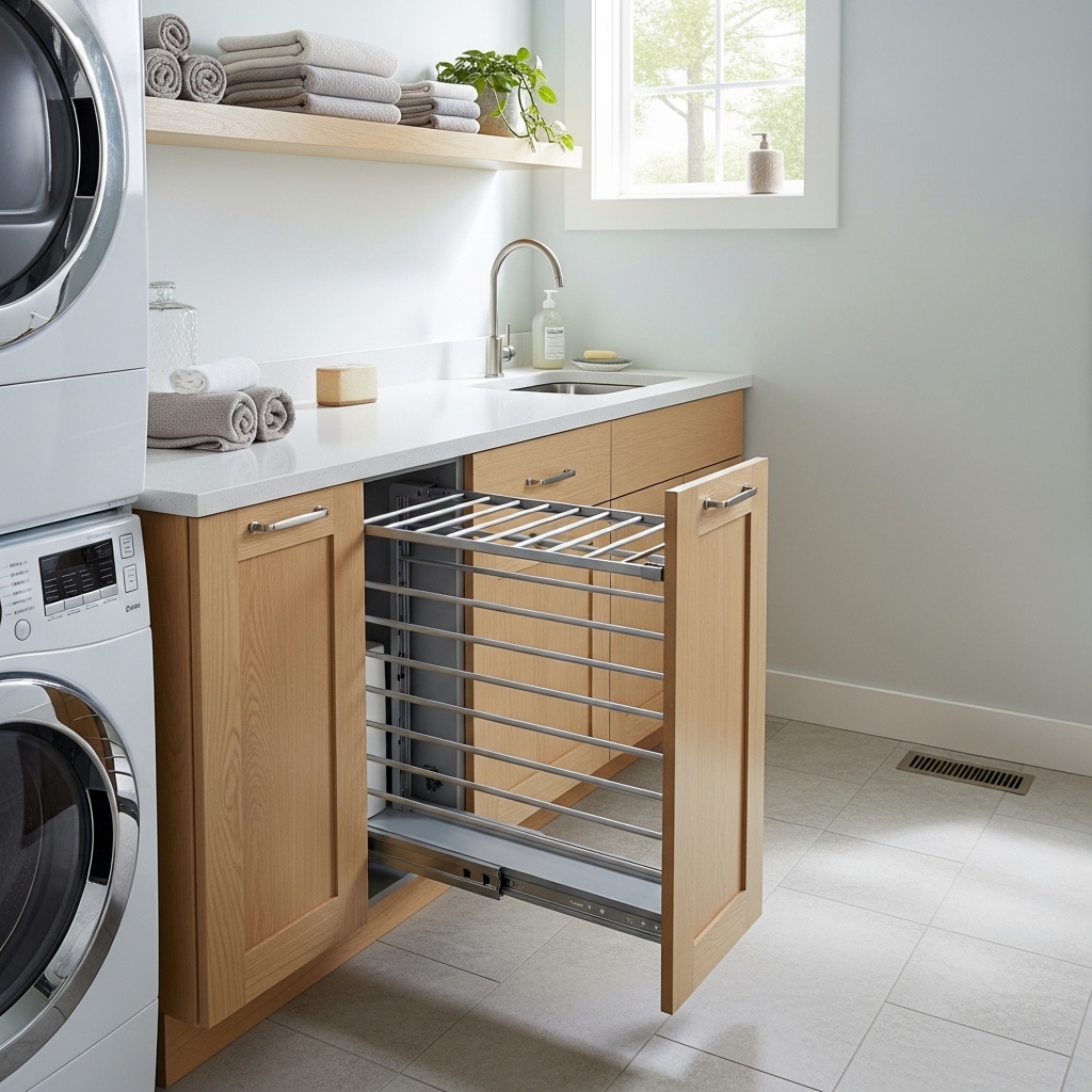 Install a retractable drying rack that slides into a base cabinet next to your washer.
