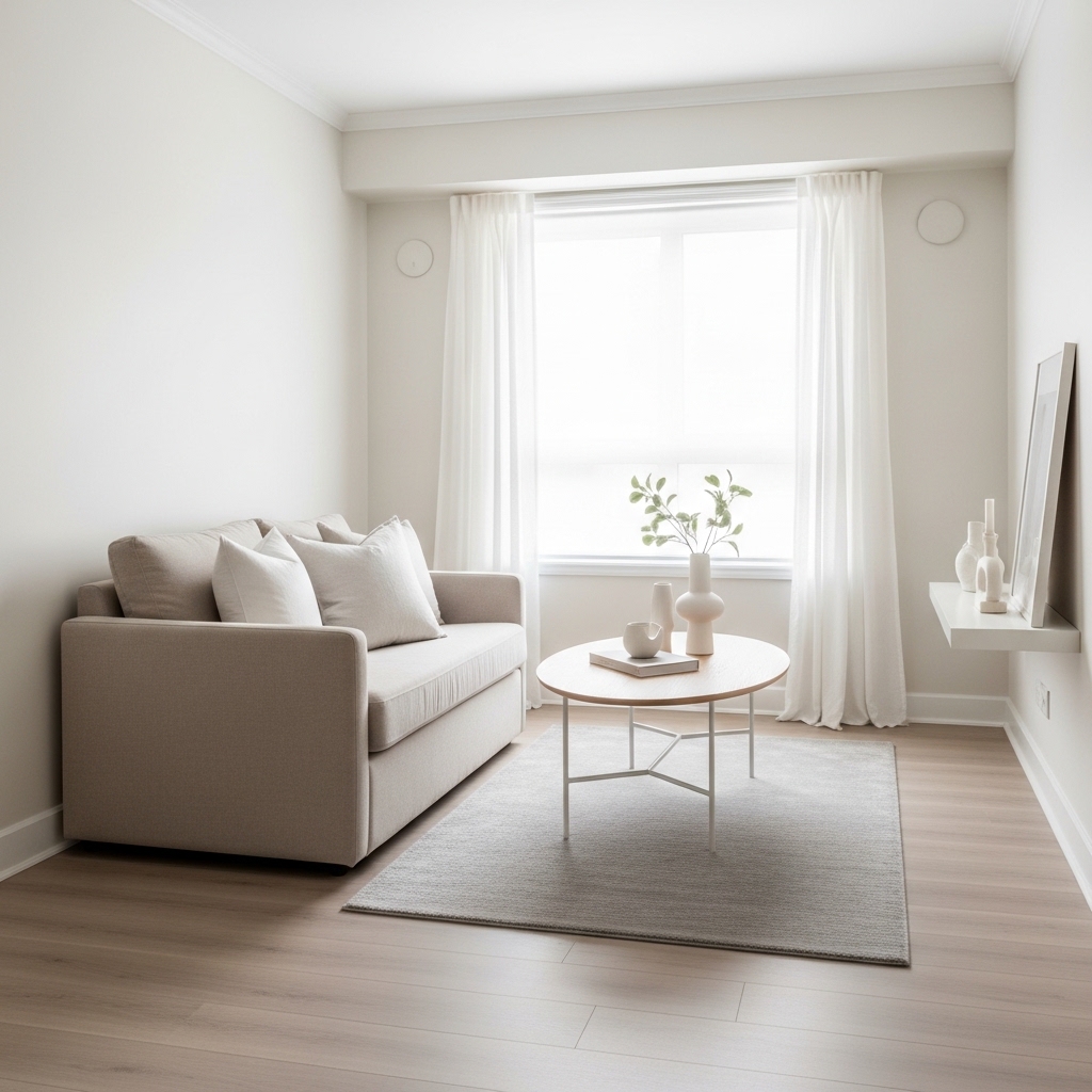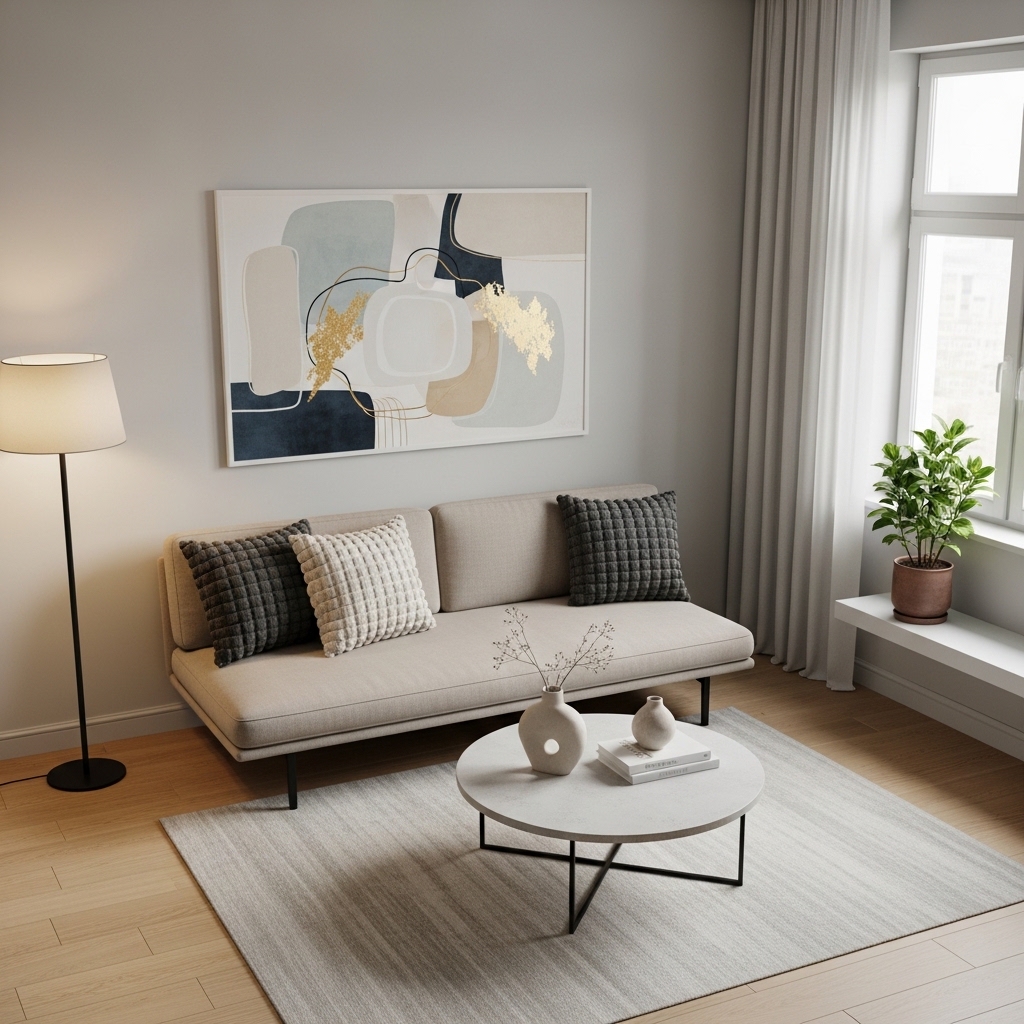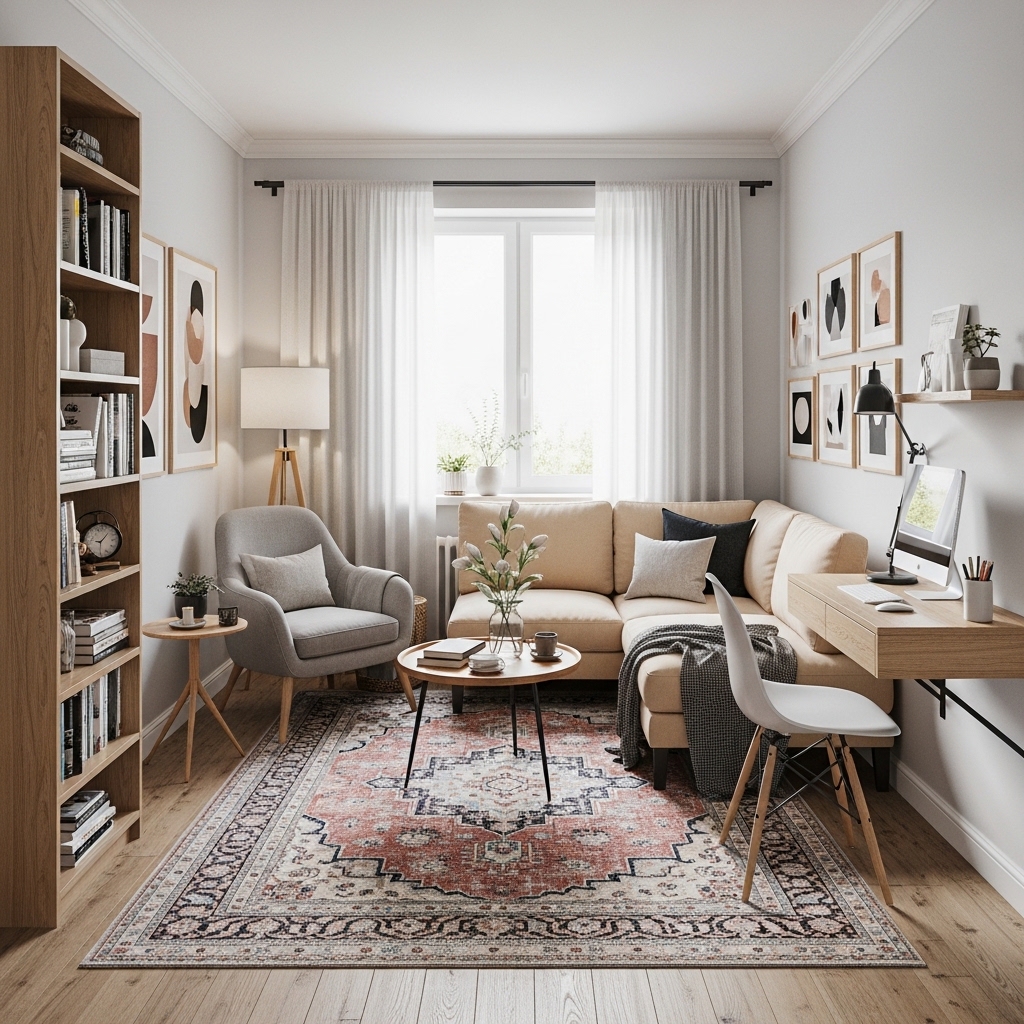 A well-sized rug anchors your seating area and prevents the room from feeling scattered. In small spaces, this is critical for creating visual structure.